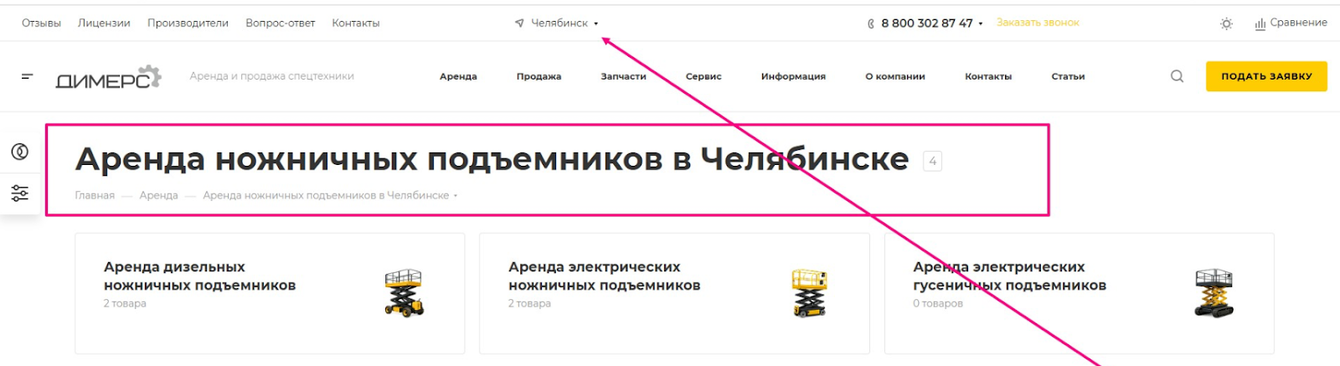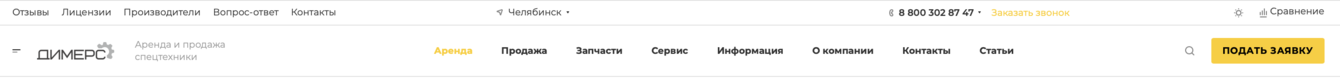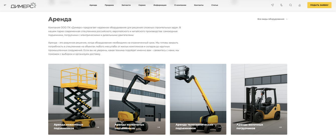 Димерс – компания по продаже и аренде спецтехники. У клиента был старый сайт (посадочная). Запрос клиента заключался в том, чтобы получить новый, современный, красивый и удобный сайт, на котором была бы представлена полная информация о выполняемых услугах по аренде спецтехники, а так же был бы каталог техники к продаже.
