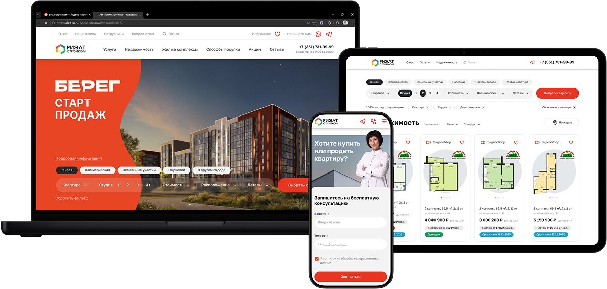 Несмотря на то, что мы сотрудничаем с АН «РиэлтСтройком» давно, и хорошо знакомы с их бизнес-процессами, масштаб проекта требовал особого внимания к деталям. Каталог насчитывает сотни объектов, маркетинговая подача должна быть чёткой и доверительной, а интеграции с 1С и Битрикс24 — бесперебойными, плюс ко всему, строгие SEO-требования. На всё это ушло время, но именно так мы заложили прочный фундамент для стабильной работы сайта и его дальнейшего роста.