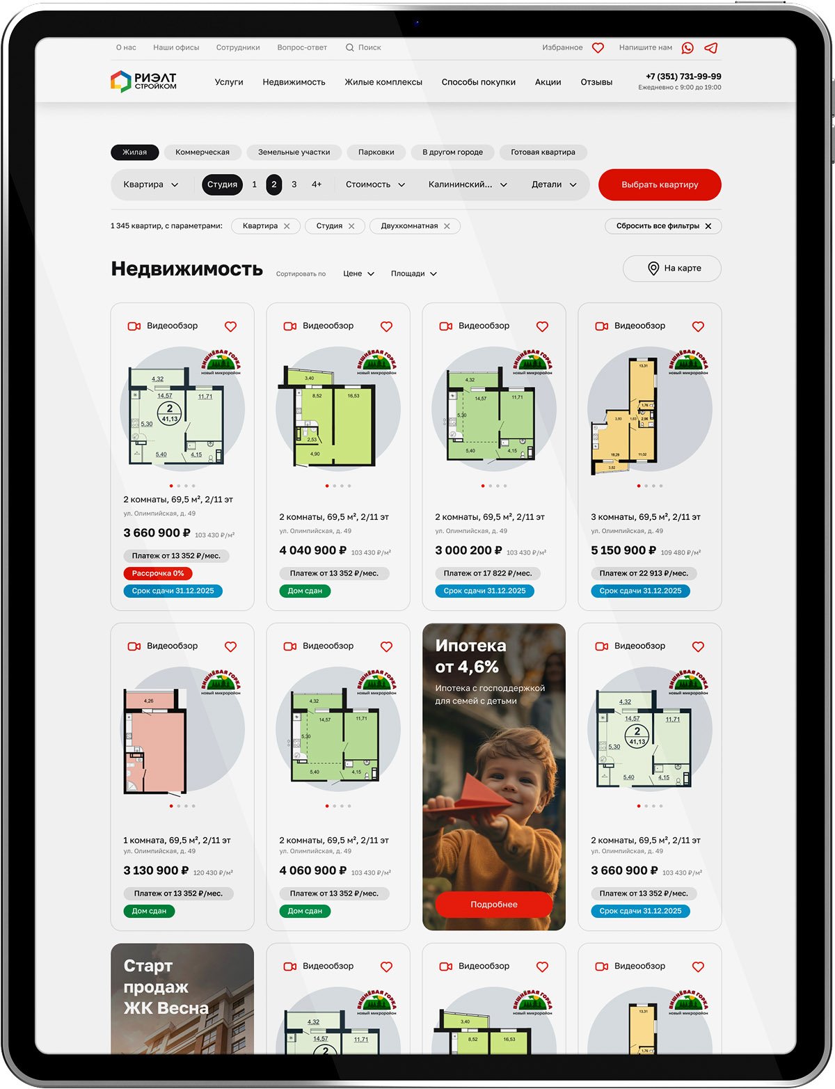 Почти все объекты первичной недвижимости сгруппированы по жилым комплексам, у каждого из которых есть собственная подробная страница. Там размещены фото текущего этапа строительства, генплан территории, описание концепции, ключевые преимущества, действующие акции и спецпредложения, а также внутренний рейтинг ЖК. Этот раздел стал одним из самых востребованных — он сильно помогает посетителям сайта в выборе.
