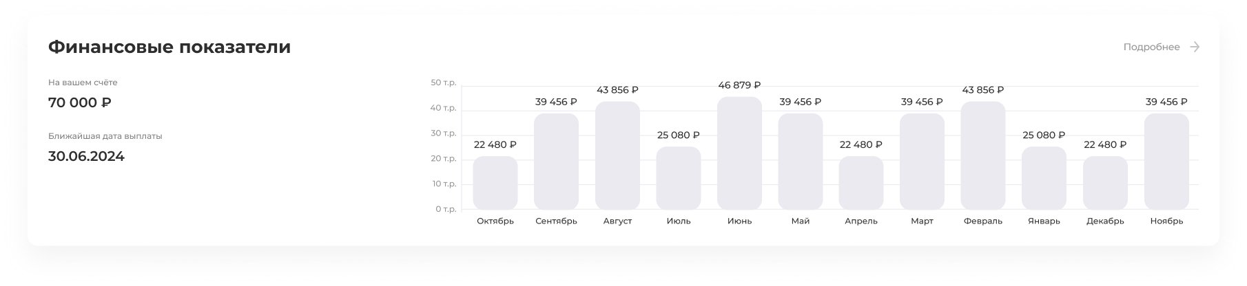 Блок с финансовыми показателями и графиками. Использовали отдельную библиотеку для визуализации, чтобы графики можно было интерактивно выделять и сравнивать.