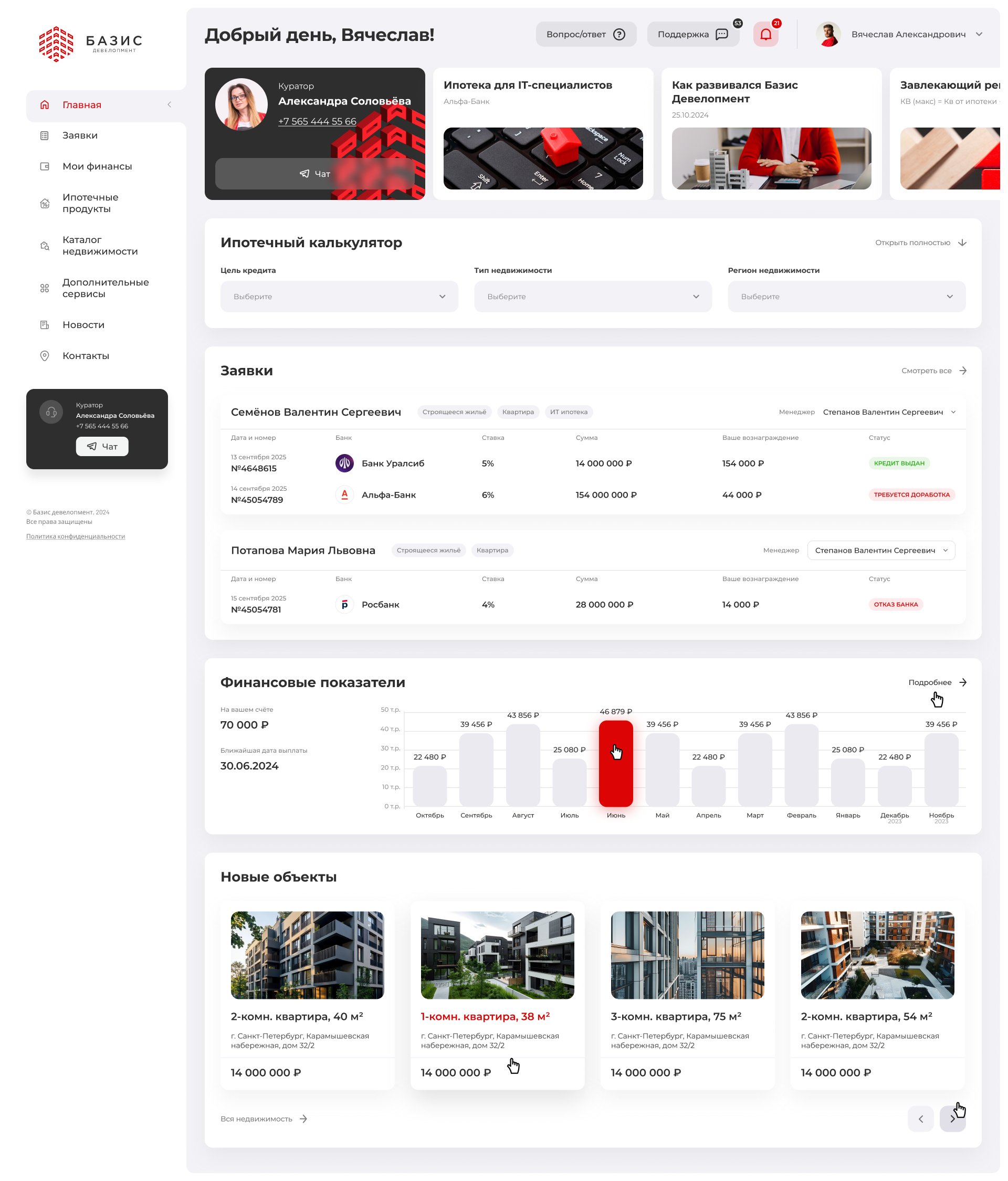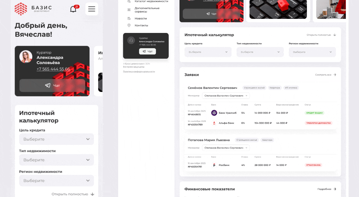 В дизайне соблюдали баланс между функциональностью и внешним видом. Стремились создать интуитивно понятный личный кабинет. Было важно сделать конкурентоспособный интерфейс с визуальными фишками и без перегруза. Задать акцент на бренд и на экспертизу «Базис Девелопмент».