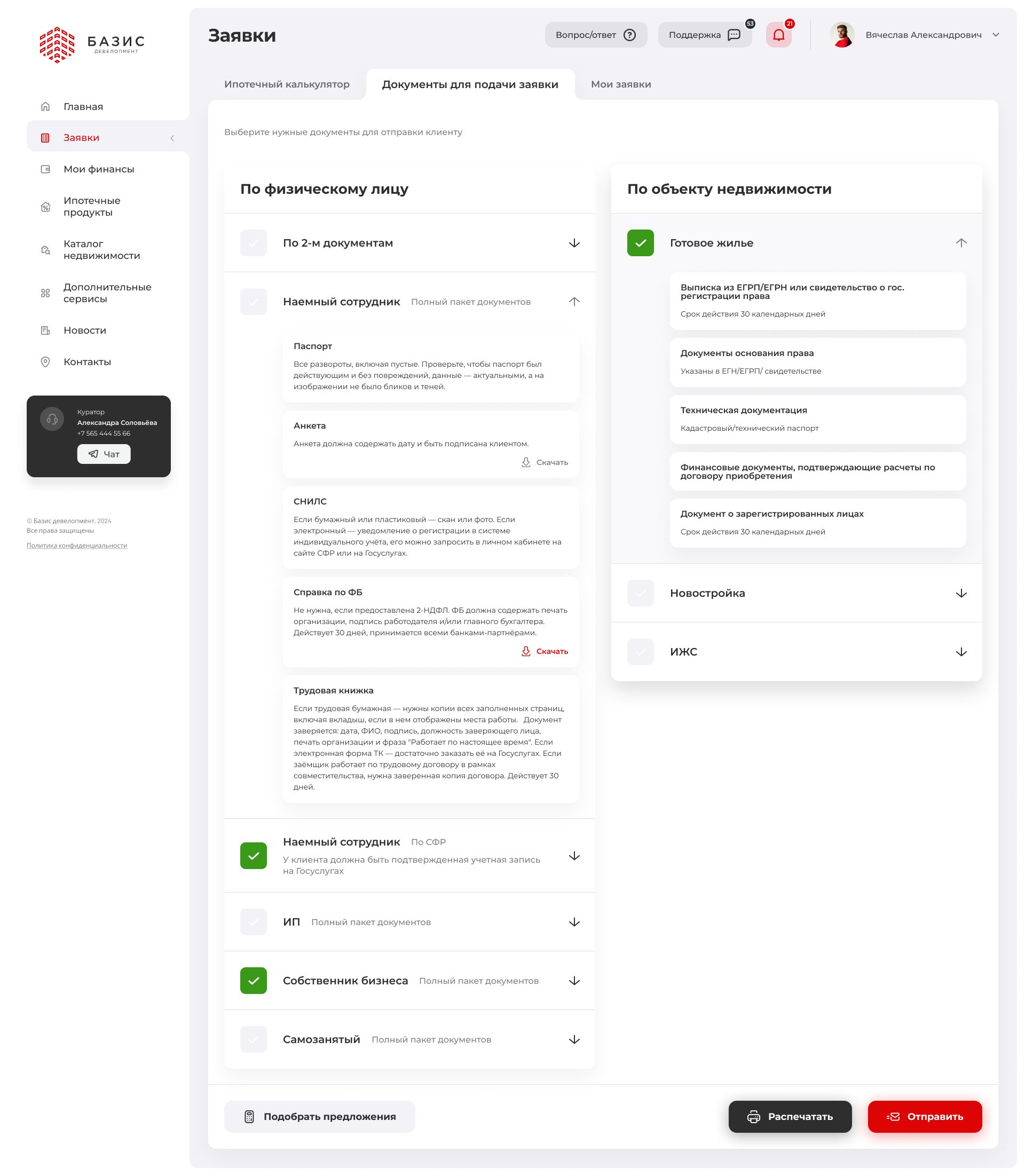 1. Разработали пошаговый сценарий подачи заявки: от выбора заёмщика и созаёмщика до загрузки документов и генерации финального пакета документов с онлайн-подписью анкеты