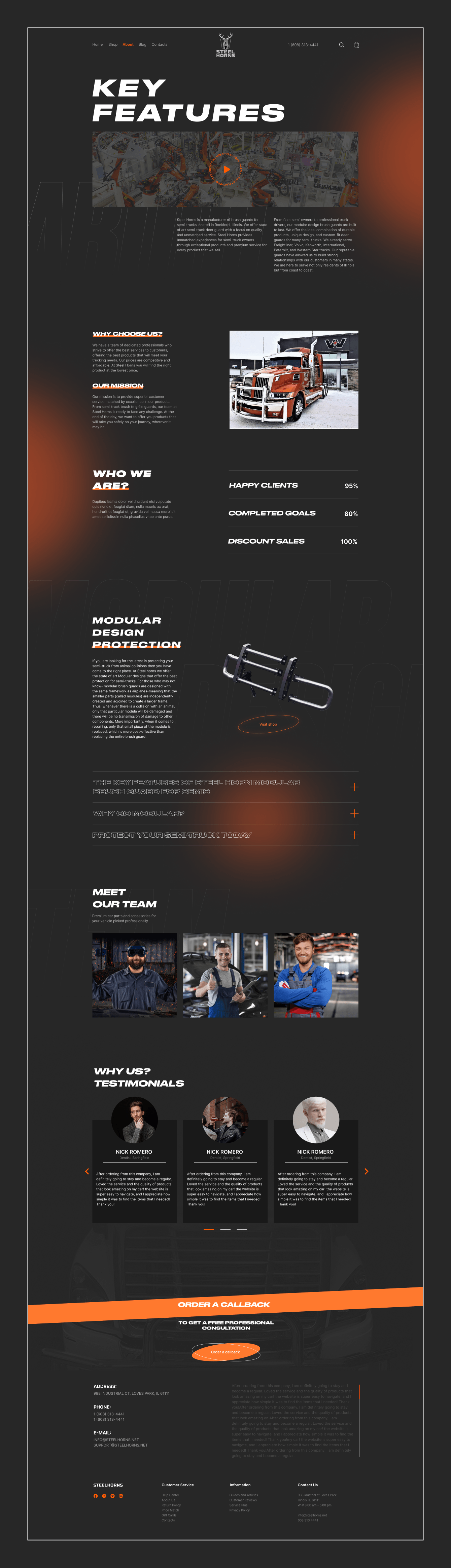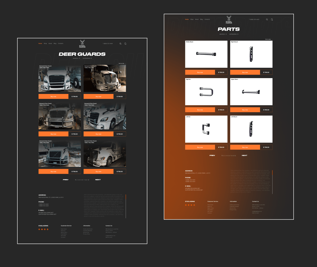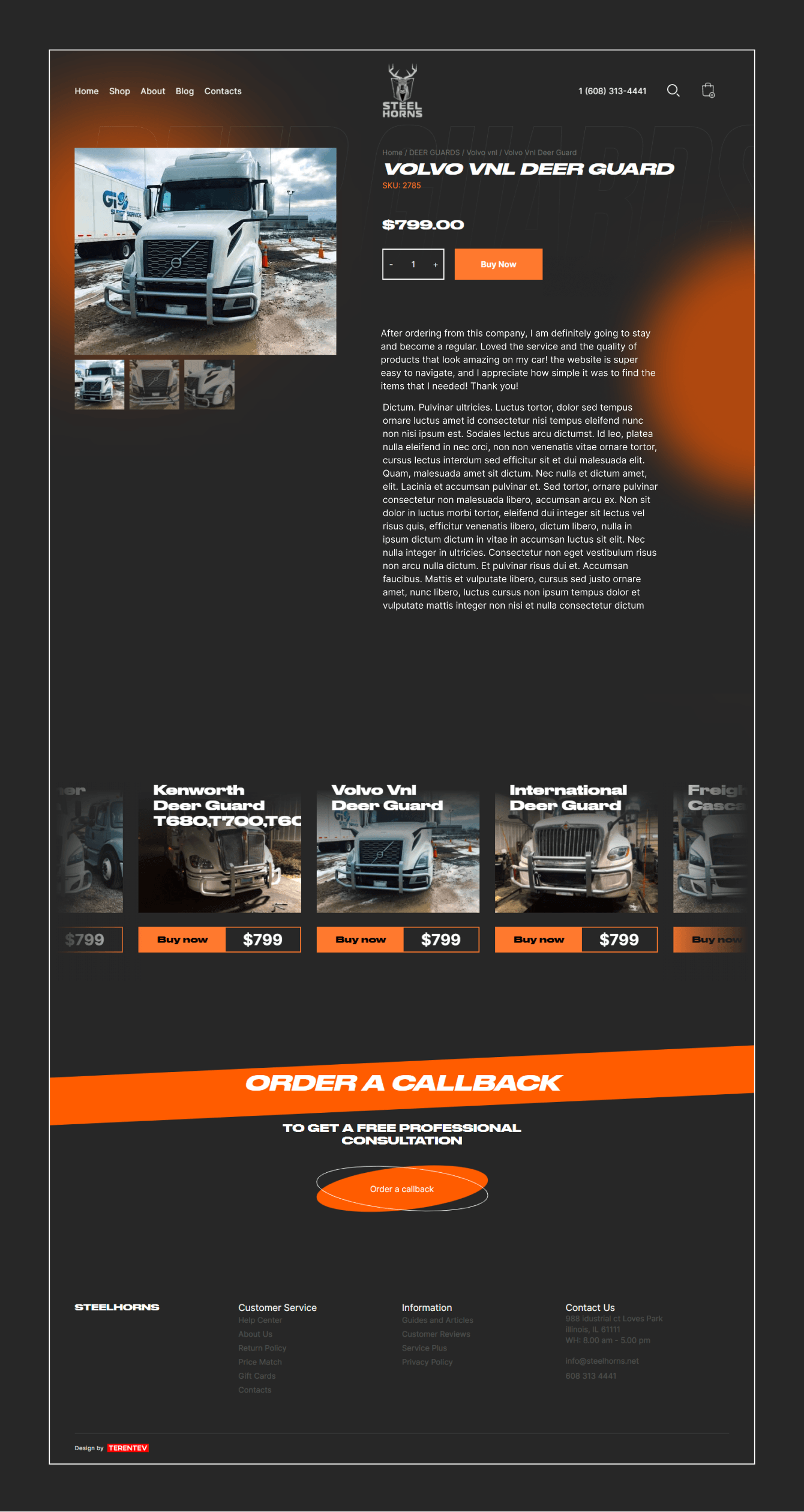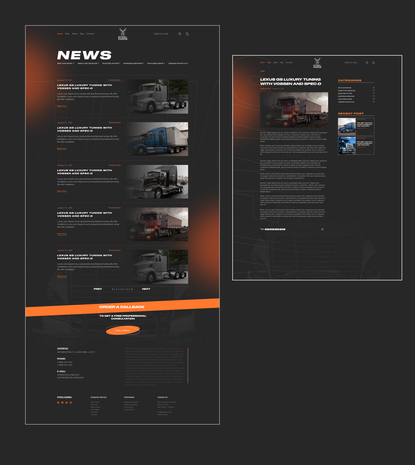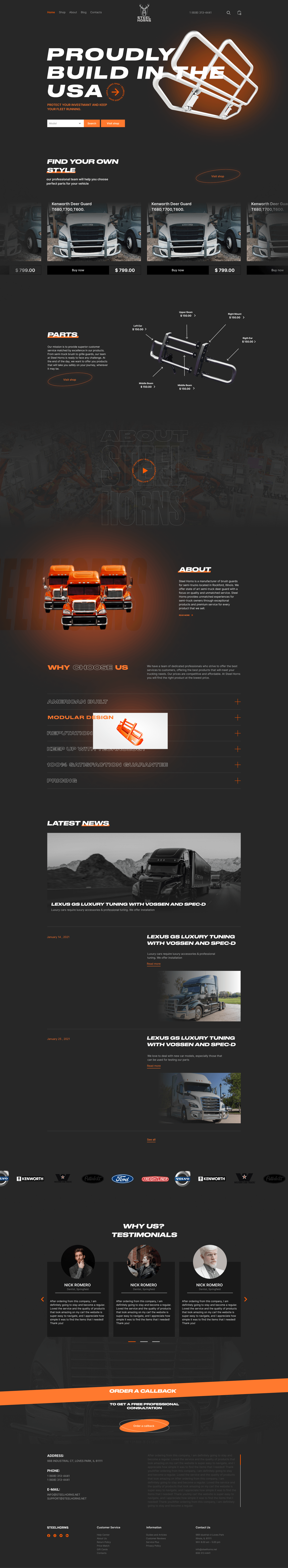 Первое, что видит пользователь на главной странице, это промо вступление с добавлением 3D модели и формы поиска по типам грузовиков. Промо страница включает в себя основные разделы сайта, презентации товаров, краткую информацию о компании, шоурил и отзывы. Немного изюминок и была создана активная 3D модель с помощью которой покупатель может с легкостью отыскать интересующую его деталь наведя мышкой на запчасть. Блог и отзывы делают главную страницу веб сайта завершенной, а модуль сео текста встроили так чтобы он не отвлекал внимание и был целостной частью сайта.