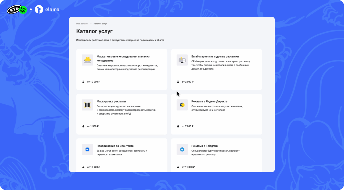 eLama, крупная платформа для автоматизации рекламных кампаний, накопила базу из 5000+ проверенных маркетологов и хотела создать фриланс-биржу для упрощения заказа маркетинговых услуг. Основной задачей было монетизировать эту базу, сохраняя высокое качество услуг и справедливое ценообразование, а также быстро протестировать спрос и запустить продукт с минимальными затратами.