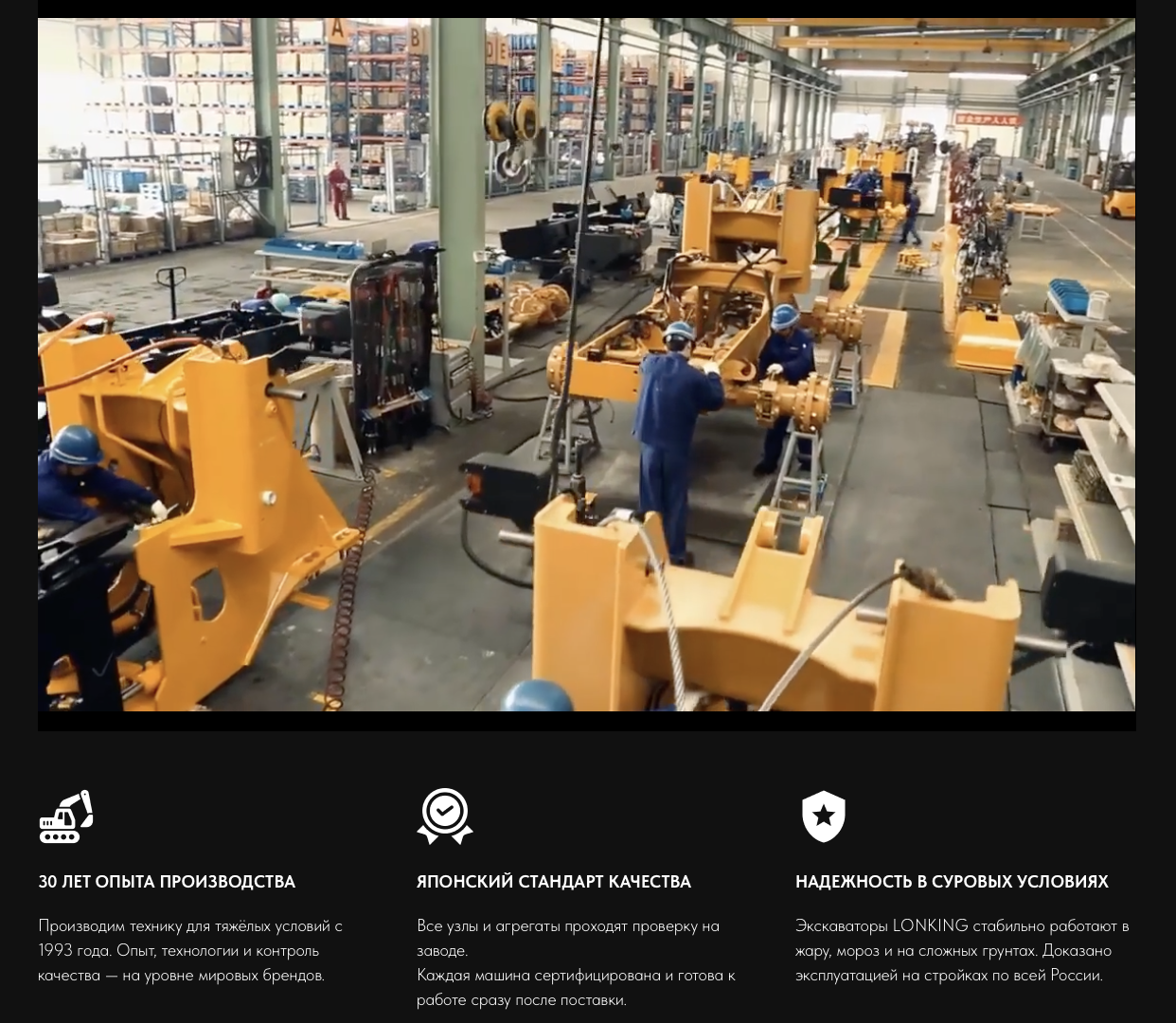 На сайте разработан блок с видео-презентацией техники, работой и масштабом производства. Также мы отразили основные преимущества техники LONKING: опыт, качество, надежность. Каждый пункт имеет более подробное описание, что позволяет повысить лояльность к бренду.