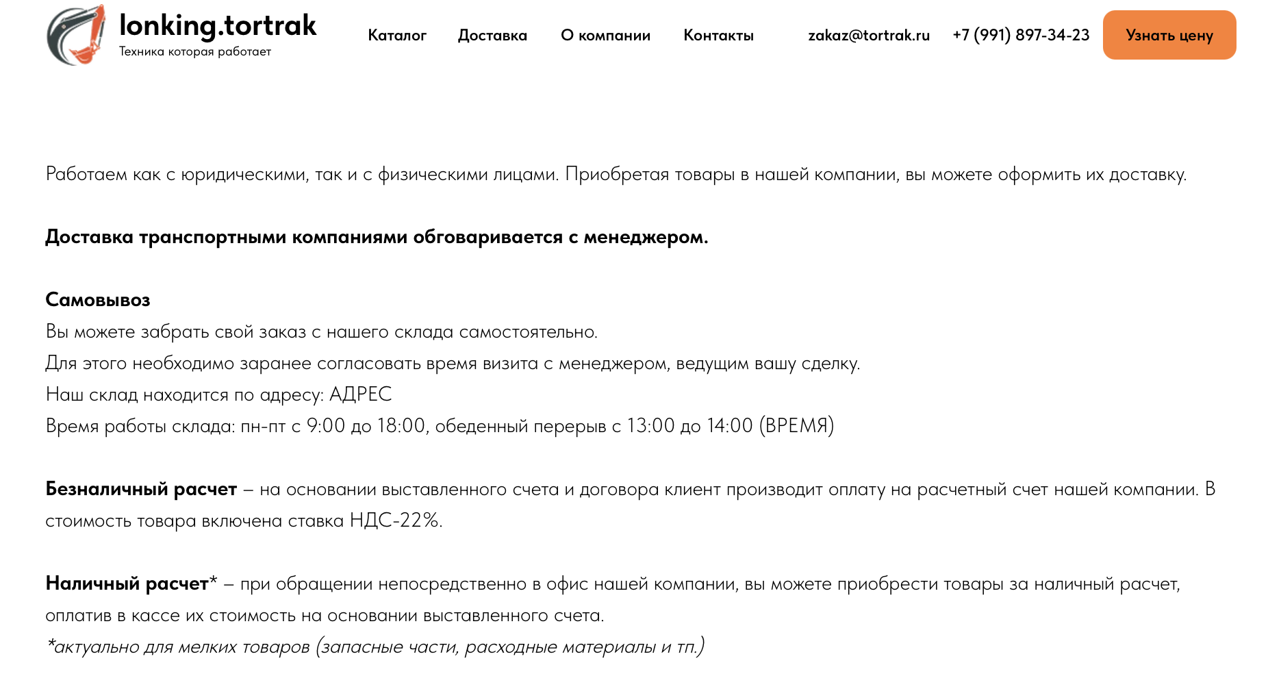 В разделе доставки собрана структурированная информация об условиях доставки (в т.ч. самовывоза) и способах оплаты.
