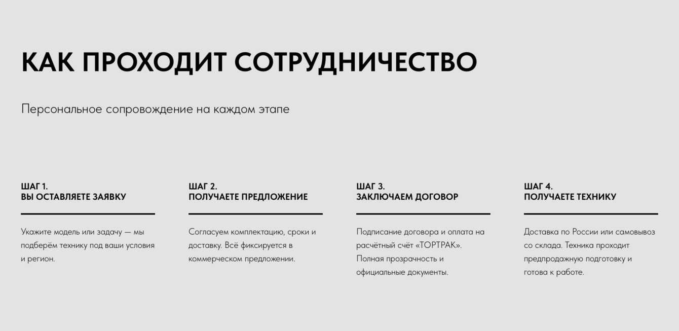 Также на основной странице размещен блок с шагами сотрудничества. Он позволяет понять как именно будет строиться дальнейшая работа от заявки до момента получения техники.