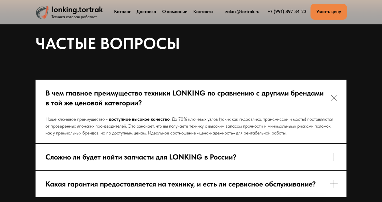 После основной информации мы разместили блок с ответами на частые вопросы (FAQ). Каждый популярный среди клиентов вопрос можно раскрыть и узнать подробный ответ от лица компании.