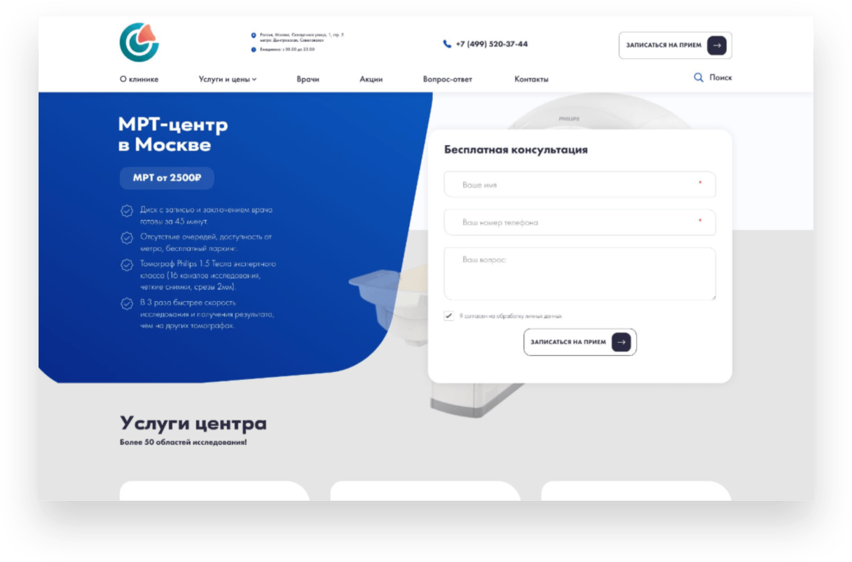 В медицинском маркетинге мы работает давно, на наш взгляд сайт должен давать развернутое и полное представление о спектре услуг и врачах клиники, а также предоставлять максимально удобную возможность записи на прием.