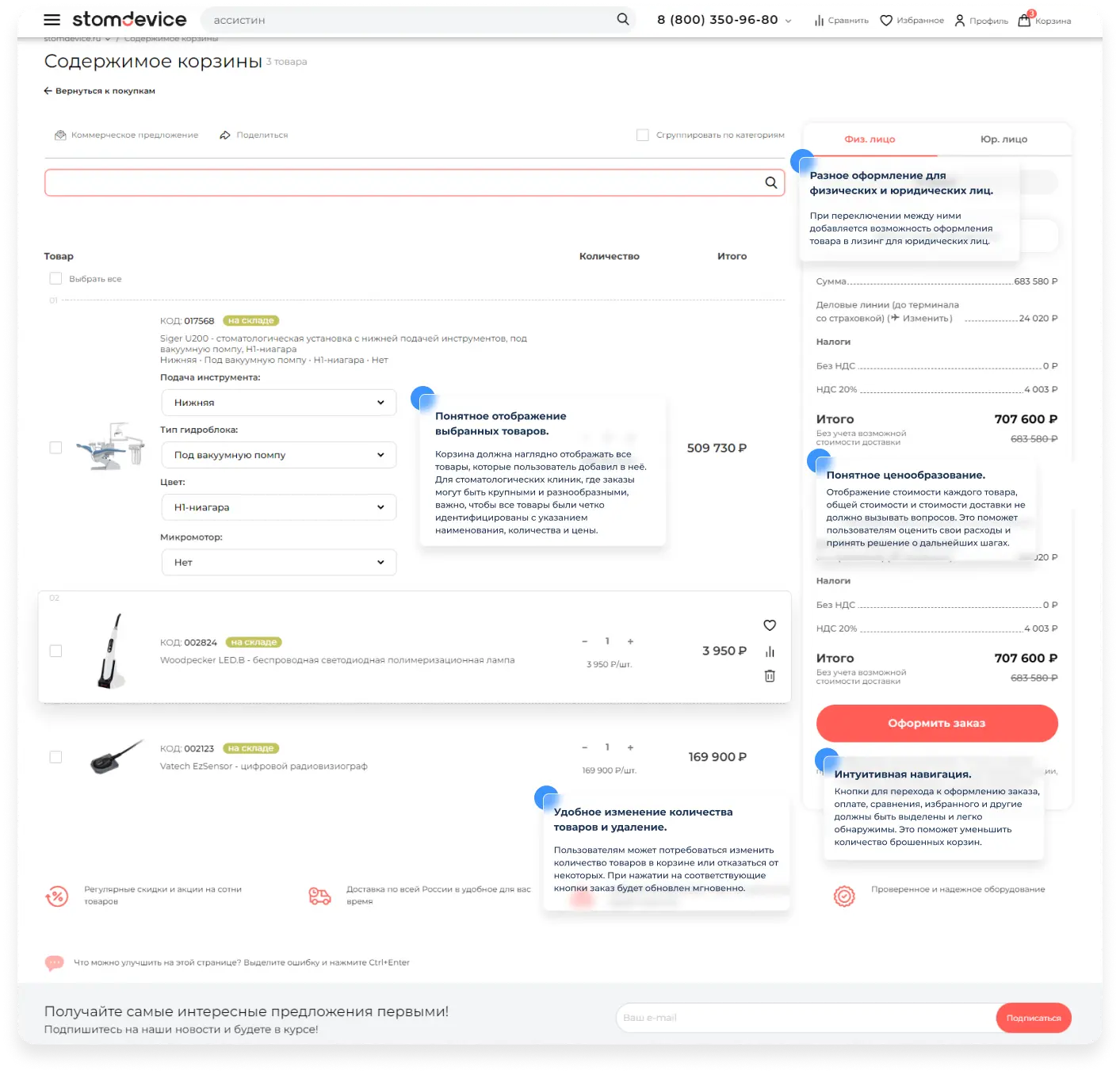 Мы улучшили интерфейс интернет-магазина Stomdevice для удобства B2B-клиентов. Это повысило уровень удовлетворённости пользователей и снизило процент брошенных корзин.