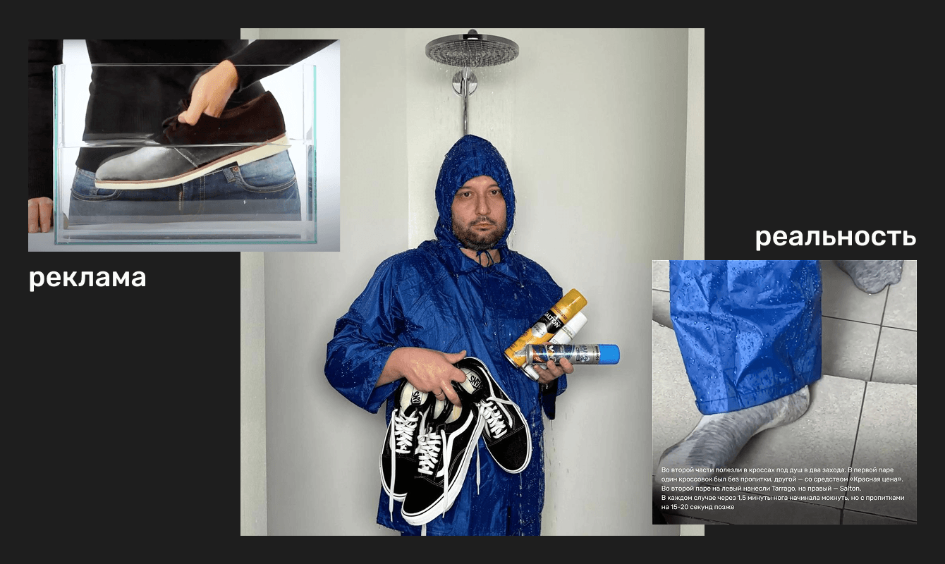 ‣ методология проведения эксперимента, которую расписываем очень подробно. Вплоть до того, какого диаметра пятно наносить и сколько часов нужно выждать. При этом условия эксперимента не должны быть лабораторными в идеальной среде, а похожи на обычную жизнь. Поэтому, проверяя водоотталкивающие пропитки, мы не будем проверять, окуная кроссовок в ёмкость с водой, а заморочимся и имитируем дождь;