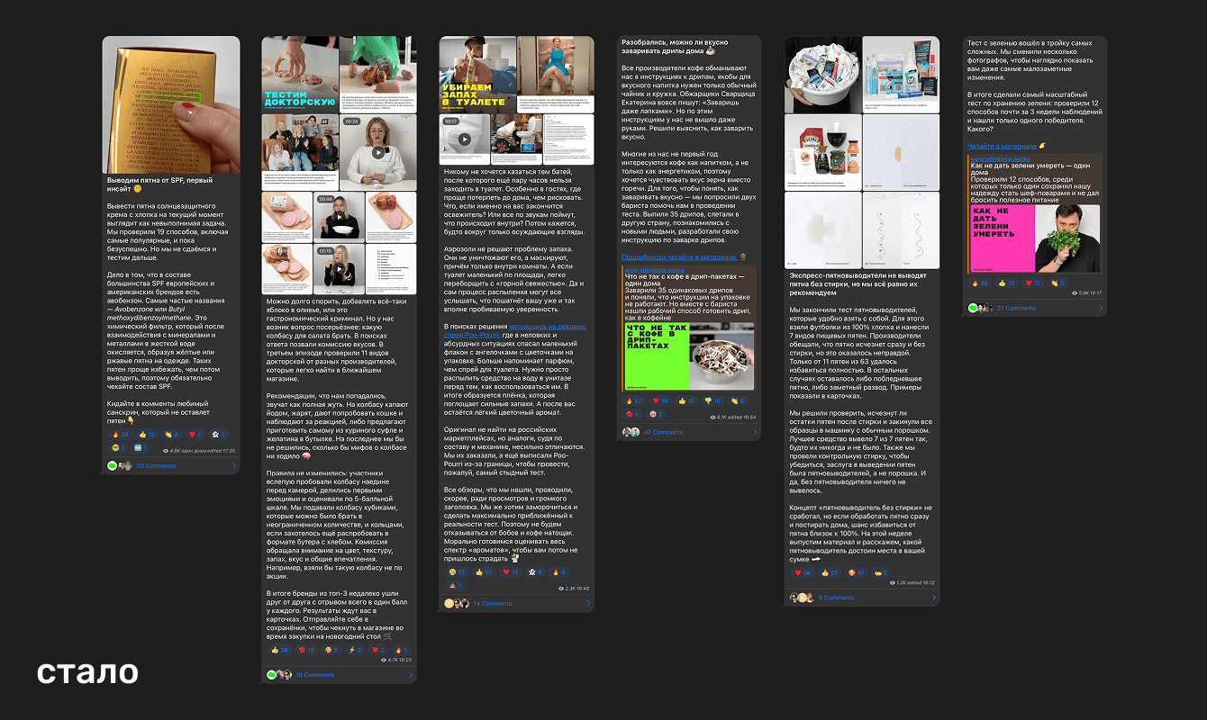 У нас два основных типа постов: инсайты, которые собирают много комментариев и реакций и анонсы, которые дают больше шеров. Иногда мы спрашиваем подписчиков, как они сами решают бытовые проблемы, и даём им возможность повлиять на наши тесты. Например, перед тестированием пятновыводителей мы спрашивали, какие пятна они чаще всего ставят на одежду.