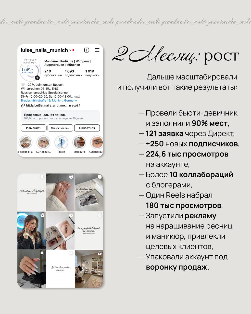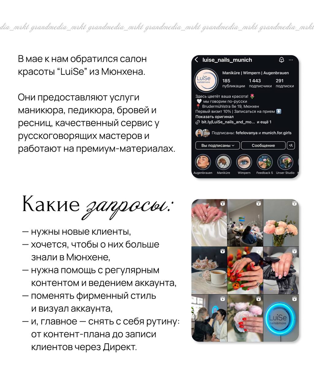Что дальше? Сегодня LuiSe — это уже не просто страница, а рабочая система для привлечения клиентов. Мы продолжаем сотрудничество уже год, создаем продуманный и эстетичный контент, получаем стабильную запись на услуги салона.