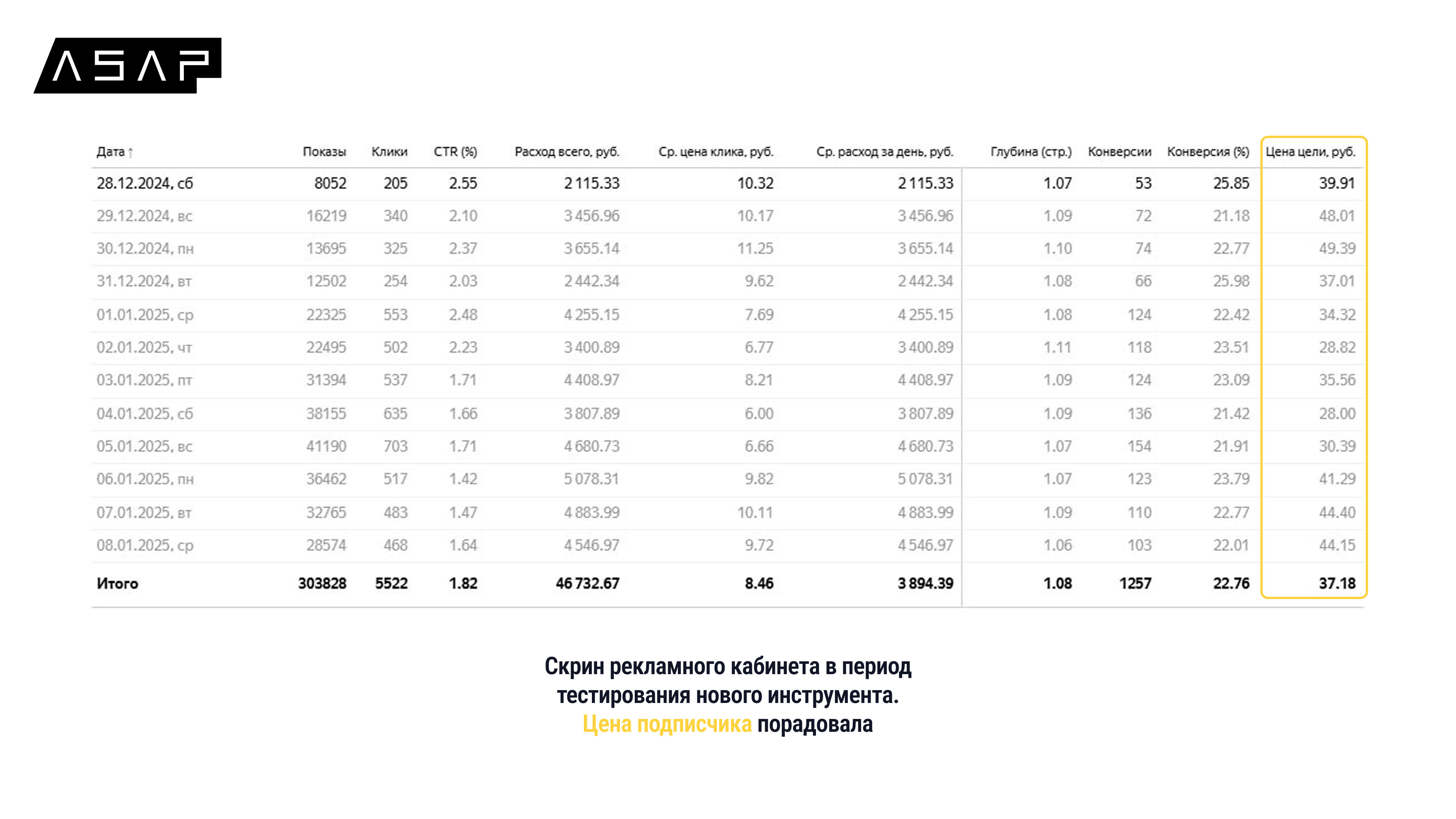И вот в конце 2023-го для «Яндекс Директа» (и, кстати, чуть позднее для «ВКонтакте») появился сторонний инструмент, позволяющий отслеживать подписки на канал как конверсии. Это означало, что теперь система может сама учиться приводить именно тех, кто реально подписывается, а не просто кликает по рекламе. Но до теста мы дошли только в середине 2024-го.