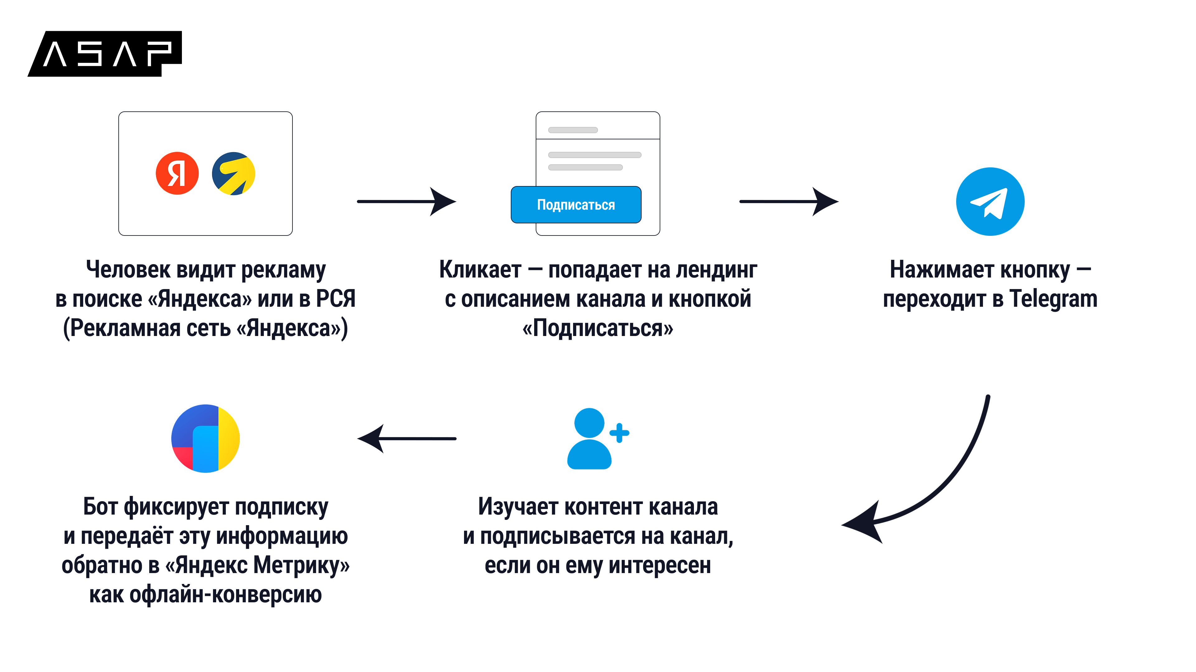Технически всё оказалось довольно просто: лендинг, «Яндекс Метрика», бот, который связывает визит с подпиской. Сложностей с настройкой не было: всё работает «из коробки», хотя своих секретов и тонкостей хватает. Например, правильное позиционирование канала на лендинге и его описание: зачем человеку, увидевшему рекламу, переходить в канал и подписываться.