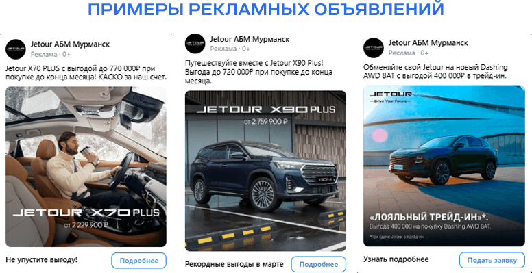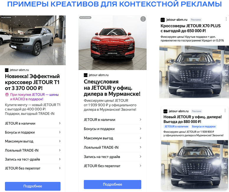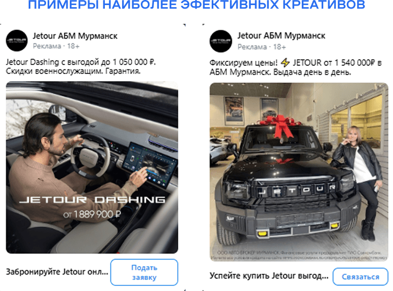 В первую очередь, важно было подготовить креативы. Наш опыт показывает, что «живые» фотографии, сделанные в дилерском центре, отрабатывают более эффективно, чем стоковые изображения автомобилей. Они вызывают большее доверие и интерес аудитории.