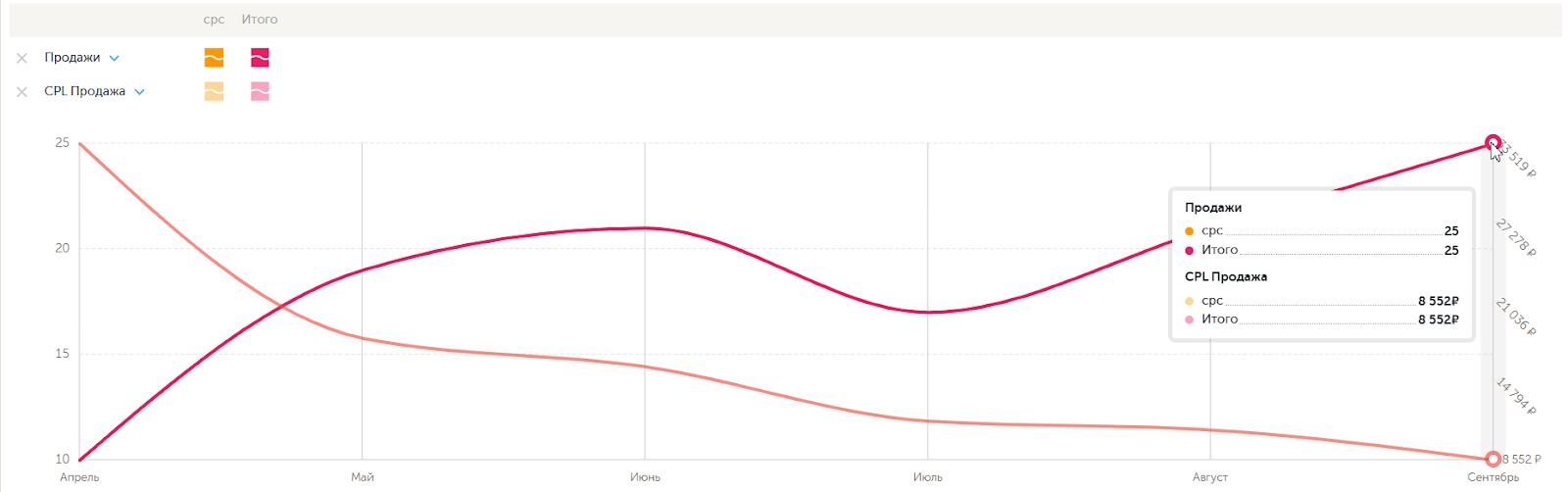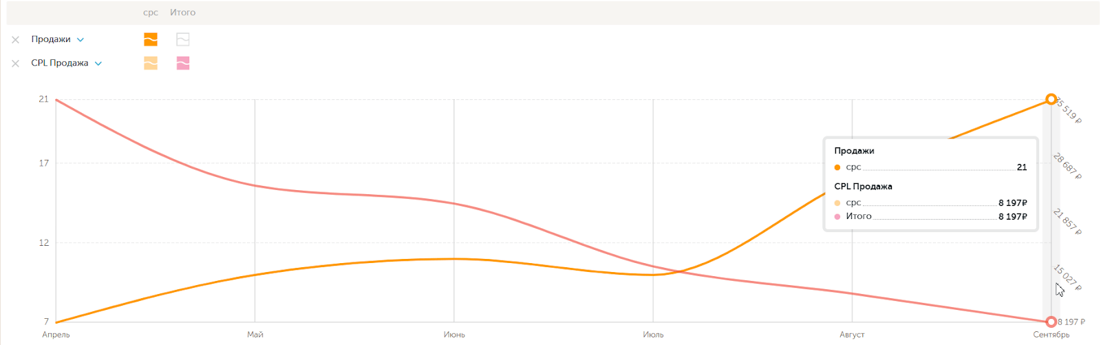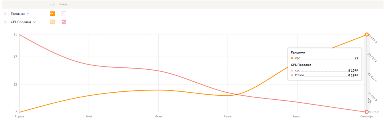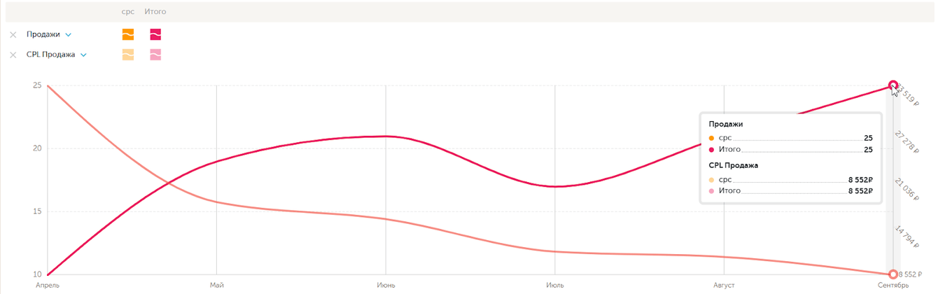 Такой подход и регулярная оптимизация кампаний на основе накопленной статистики позволили нам добиться постепенного снижения стоимости целевого лида в 4,3 раза (до 8 197 ₽ в сентябре 2025) при увеличении количества лидов в 3 раза (с 7 до 21 за месяц).