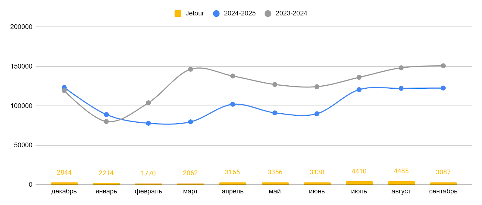 С начала 2025 года на автомобильном рынке произошел резкий спад. С февраля количество продаж новых автомобилей по стране стало стремительно уменьшаться относительно показателей прошлого года. Так, в феврале 2025 разница в количестве продаж составила 24,9%, а в марте — уже 45,5%. При этом и интерес к бренду Jetour в начале года стремительно уменьшался.