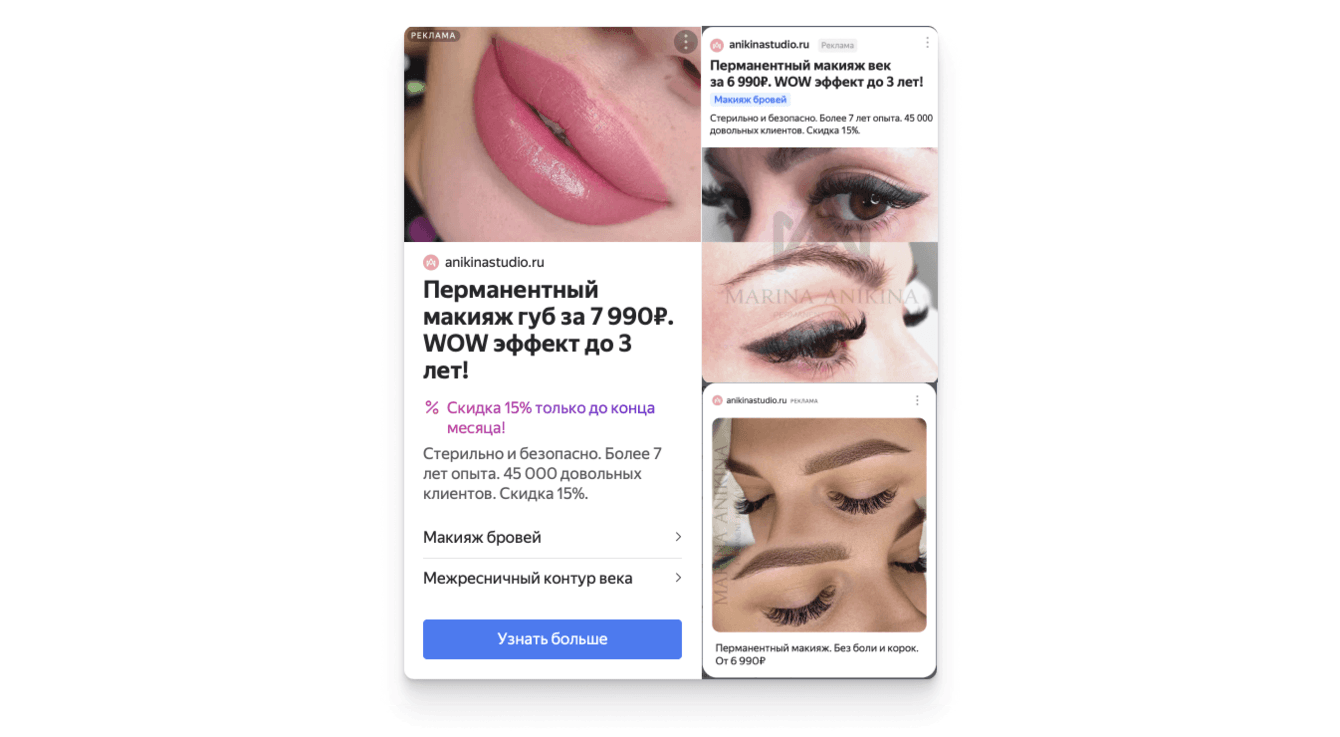 Таргетировались на 3 аудиторных сегмента: ключевое семантическое ядро, посетители сайтов конкурентов, других салонов перманентного макияжа и широкая аудитория. Выявили лучшие связки и масштабировали их.