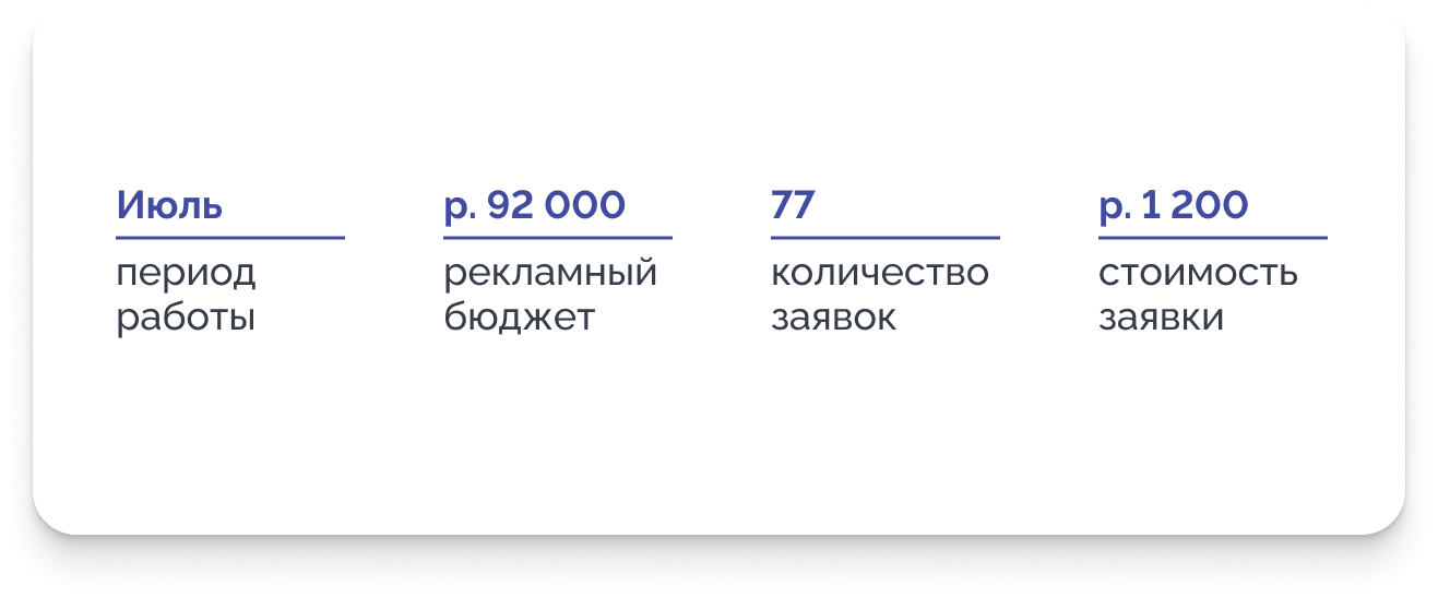 В первый месяц работы мы получили обращения по 1 800 руб. На 2 месяце работ мы увеличили рекламный бюджет, и стоимость обращения ожидаемо поднялась до 2 300 руб. После увеличения бюджета мы оптимизировали кампании, проанализировали спрос и поняли, что в выходные дни у нас минимальное количество входящих обращений, поэтому для того, чтобы тратить бюджет более эффективно, мы снизили расходы в выходные дни. Теперь в будни мы усиливаем расход и получаем больше заявок, в выходные снижаем и показываем только по целевым запросам. С такими корректировками нам удалось снизить стоимость лида до 1 200 руб.