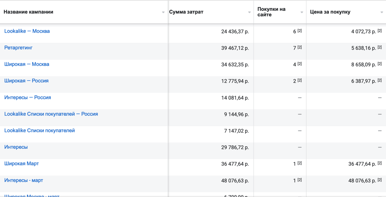 После прогрева кабинета мы поставили в план тестирование кампаний с целью Purchase.