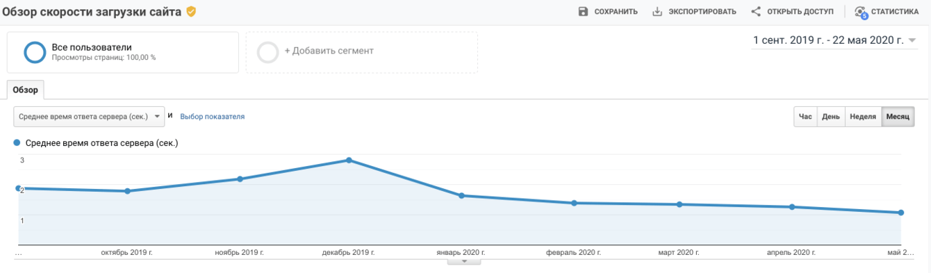 — Общий итог оптимизации серверной части виден на графике ответа сервера. Взяли период с сентября 2019-го по май 2020-го.