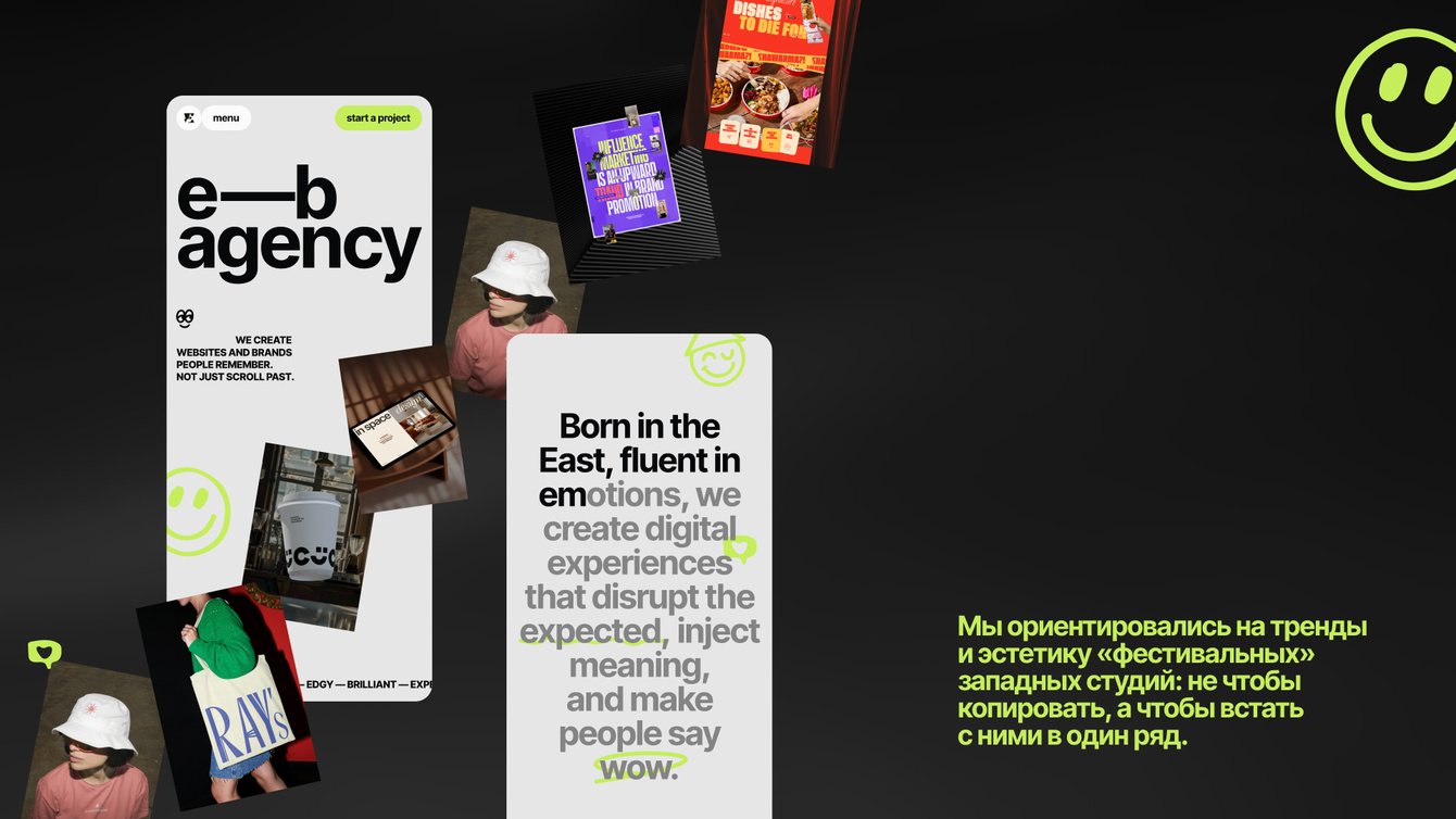 Мы ориентировались на тренды и эстетику «фестивальных» западных студий: не чтобы копировать, а чтобы встать с ними в один ряд. В основе был принцип баланса между креативной смелостью и ощущением надежности.
