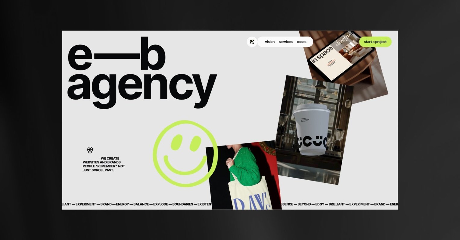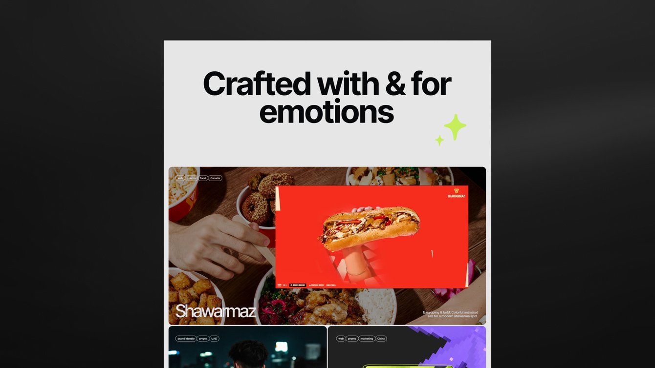 Визуально сделали сайт минималистичным по структуре, но эмоциональным по подаче: яркая типографика, крупные акцентные заголовки, анимированные проекты, которые показывают нас без объяснений.