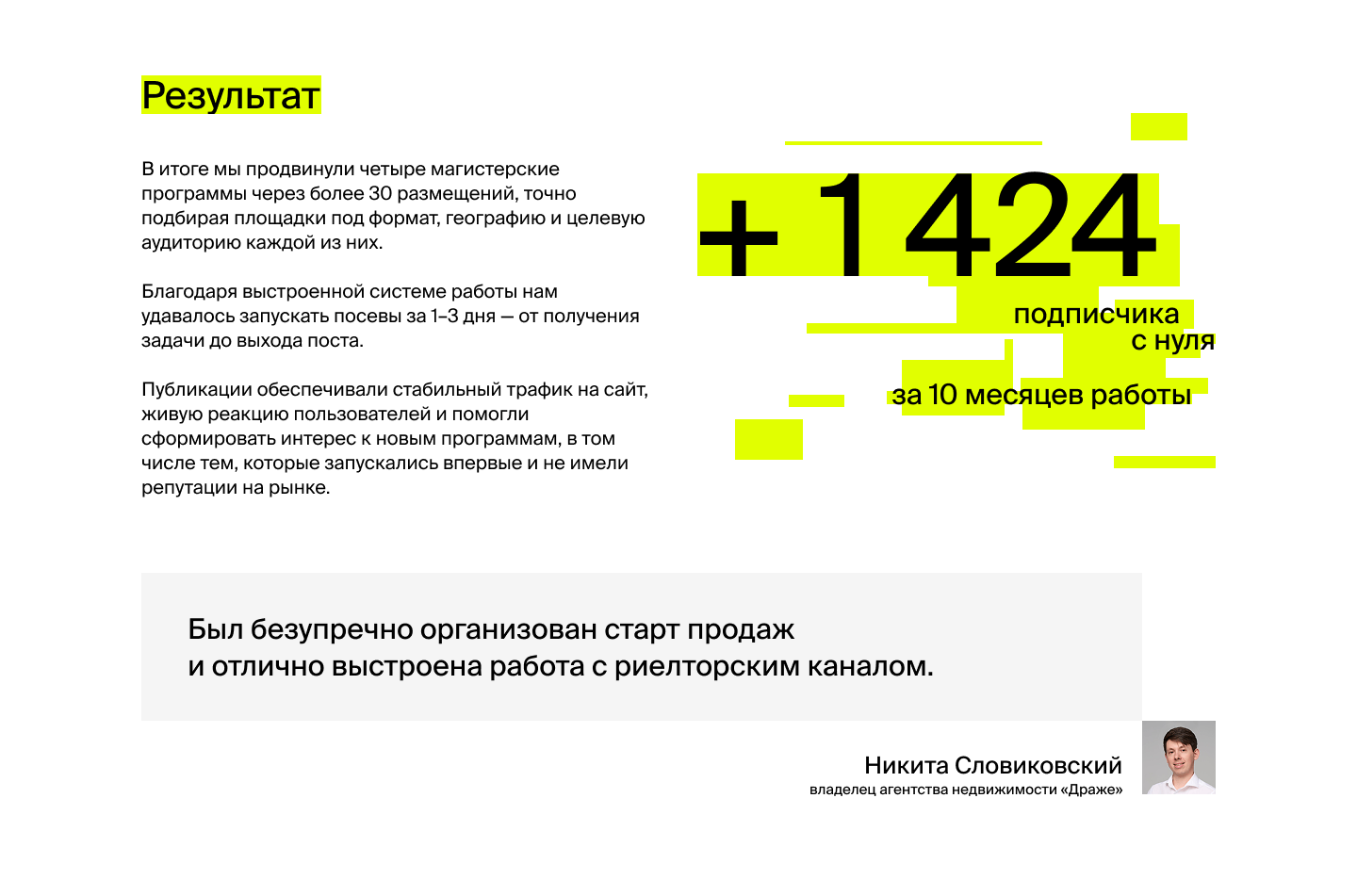 Клиент обратился с задачей — запустить Telegram‑канал для риелторов. Партнерский канал был важным элементом стратегии продаж, особенно для нового девелопера, выходящего на рынок.