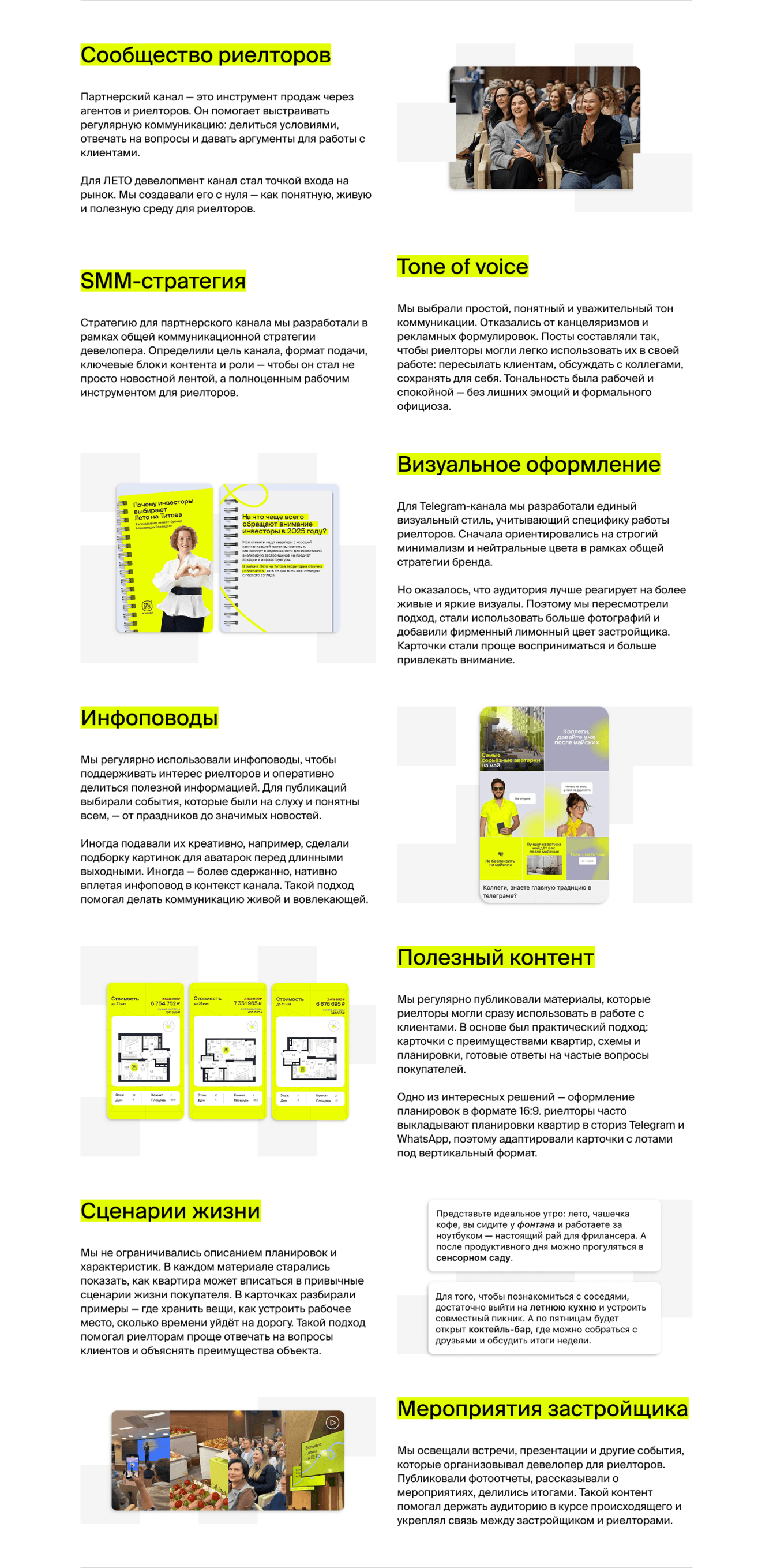Нужно было собрать аудиторию, выстроить регулярное присутствие и формат коммуникации, разработать стиль подачи и подготовить контент, который будет не только информировать, но и помогать в работе с клиентами.