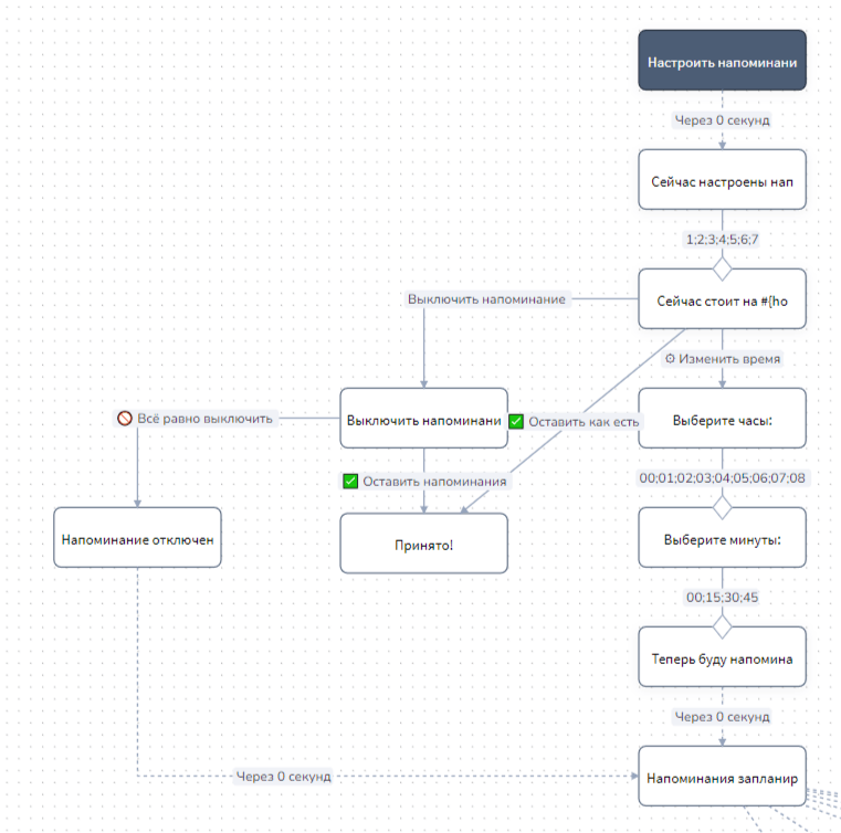 Скриншот из конструктора бота, описывающий сценарий «Настройки напоминаний»