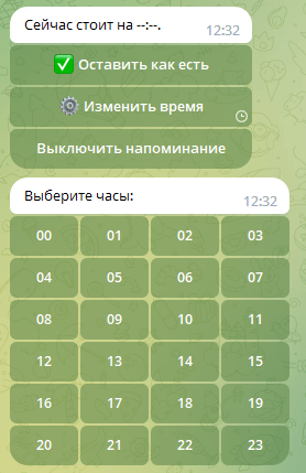 Подписчик бота может изменить время напоминания, отключить и включить его.
