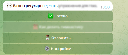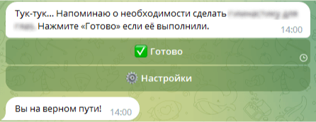 Если кнопка «Готово» не нажата в течение 30 минут, приходит мотивирующее сообщение. Отложить каждое напоминание можно только один раз. Первое сообщение и ответ после кнопки «Готово» выбирается случайно.