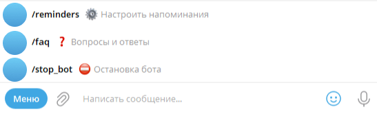 Таким образом, пользователь может с помощью меню настроить напоминания, получать ответы на свои вопросы или выйти из бота.