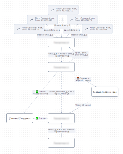 Скриншот из конструктора бота, описывающий сценарий «Напоминание о выполнении рекомендаций»