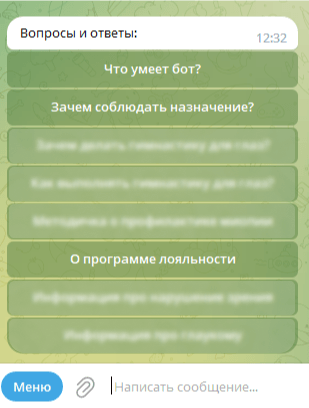 Скриншот из чат-бота в Telegram: раздел с вопросами про нарушение зрения