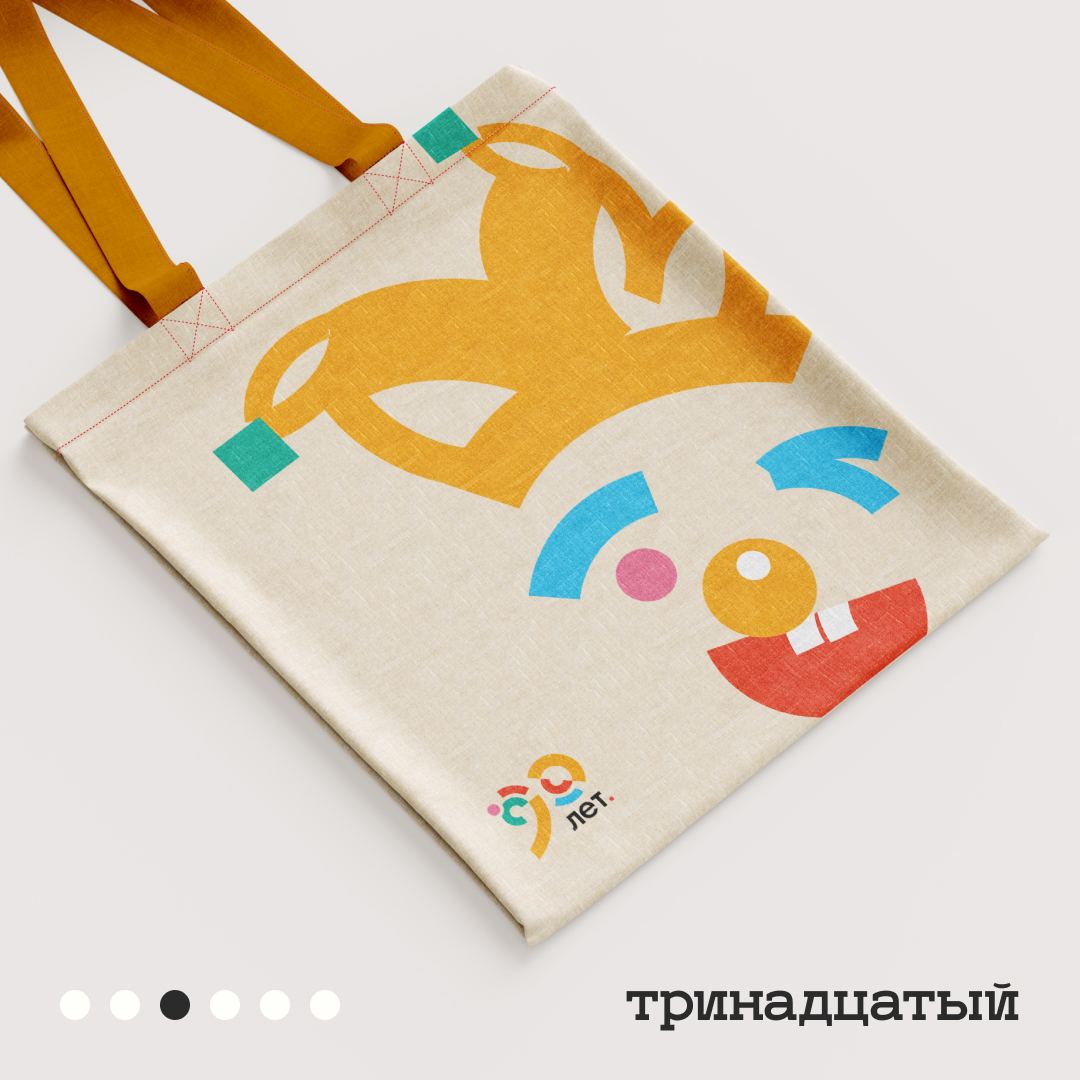 В основе логотипа — число 90, которое складывается из разноцветных геометрических фигур с эффектом аппликации. Вдохновением для этоого послужили детские игровые конструкторы из крупных деталей, которые можно по-разному сочетать и каждый раз получать новые образы.
