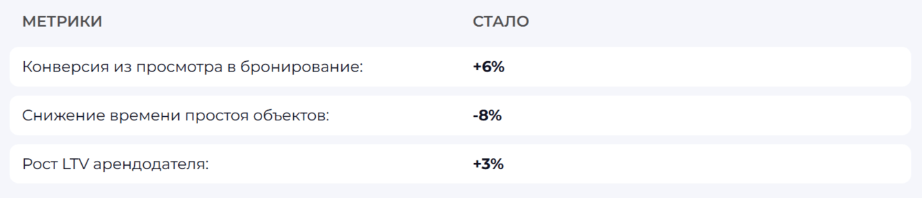 В ходе пилота замеряли реальные бизнес-метрики: как изменились выручка, загрузка и средний чек, как реагировали и насколько были удовлетворены хосты, а также оценивали устойчивость модели к сезонным и локальным колебаниям спроса.