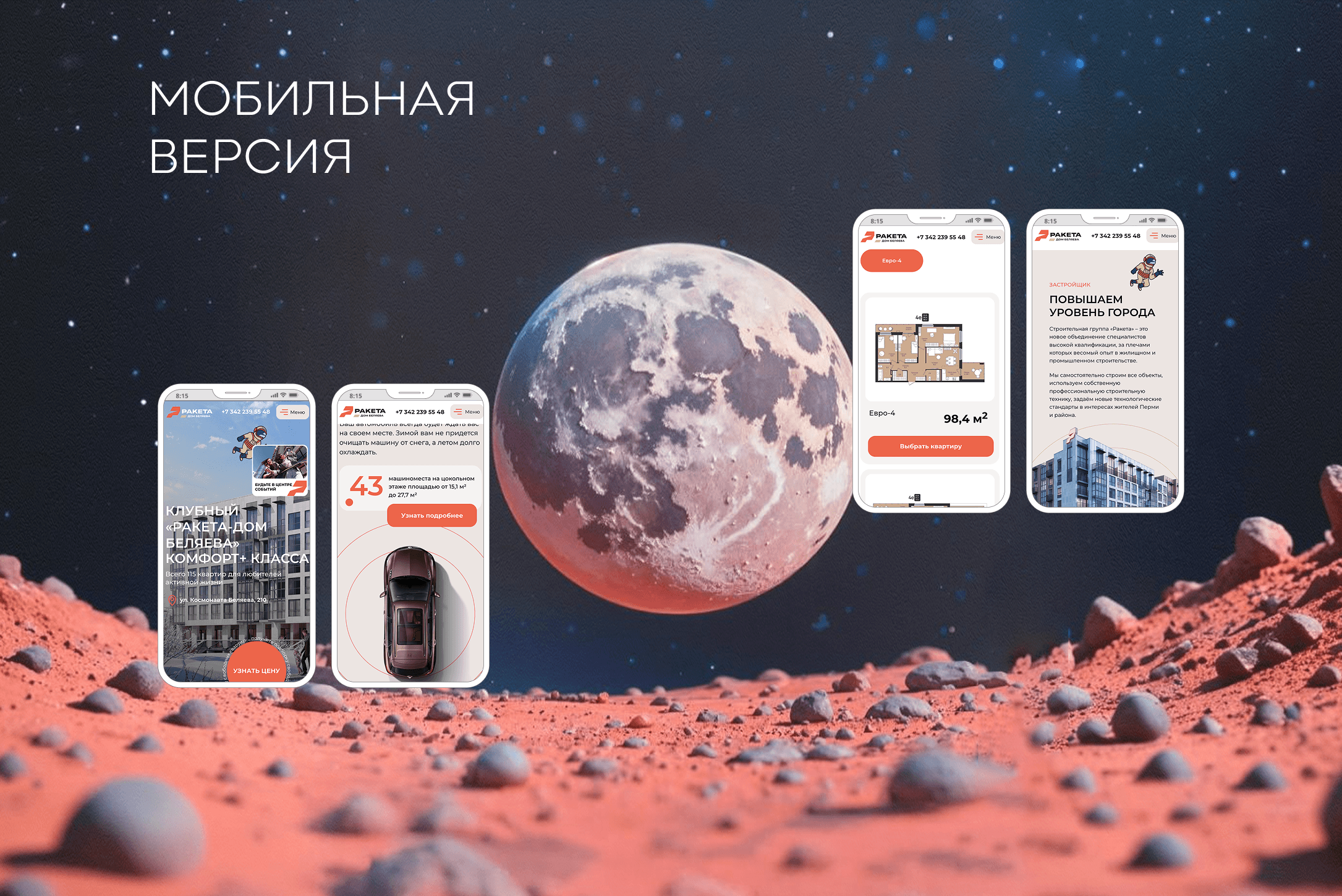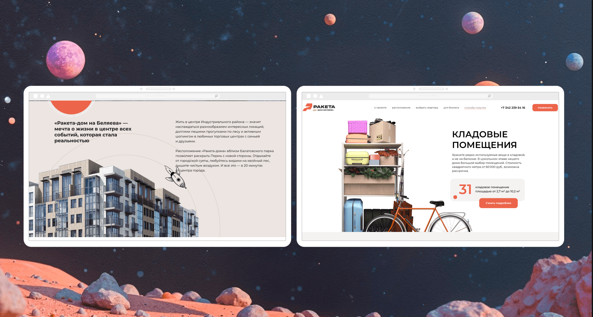 Поскольку в названии комплекса присутствует слово «ракета», и кроме того, это слово является названием застройщика, решено было окончательно и бесповоротно в оформлении лендинга обыгрывать тему космоса.
