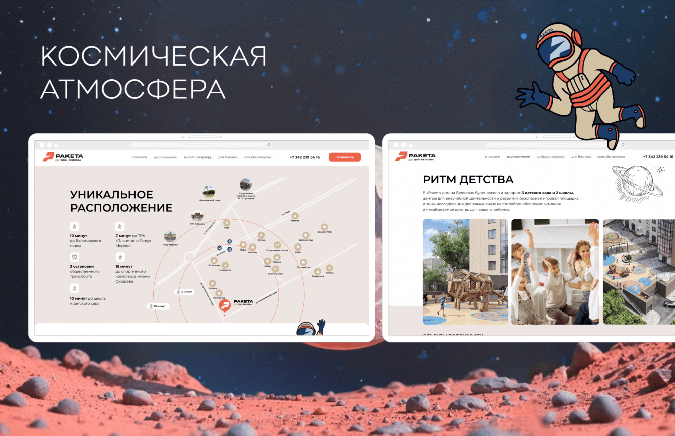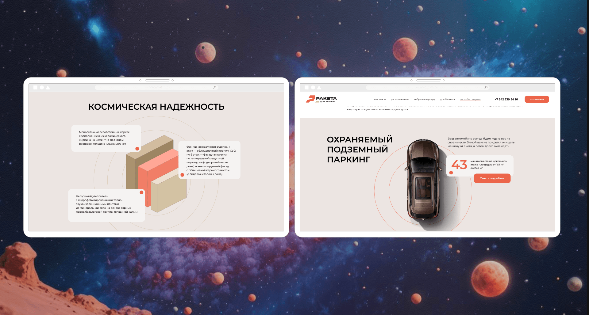 Тему космоса дополнительно обыграли в названии заголовков блоков, например: «Космический комфорт», «Ваша звездная квартира», «Космическая надежность».