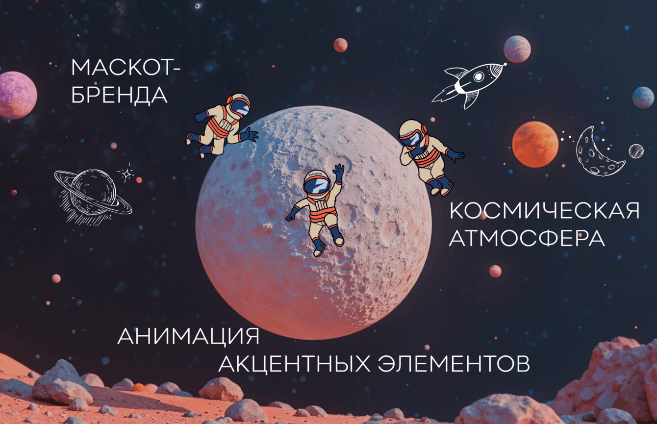 В итоге решили использовать лишь отдельные элементы темы космоса, которые создают атмосферу и не нагружают сайт визуально: нарисованные тонкими линиями звезды, планеты, месяц, ракета. Также в некоторых блоках присутствует маскот бренда — космонавт.