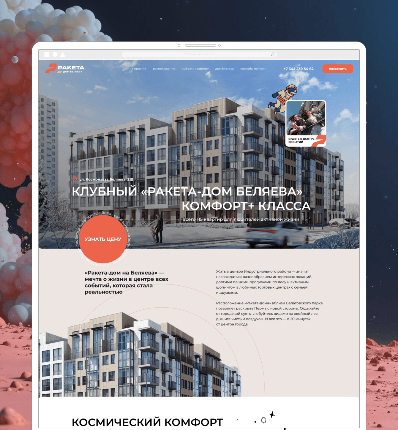 Немного о проекте: ЖК «Ракета-дом Беляева»— клубный дом класса «комфорт +» в центре Индустриального района Перми на улице, названной в честь космонавта Павла Беляева.