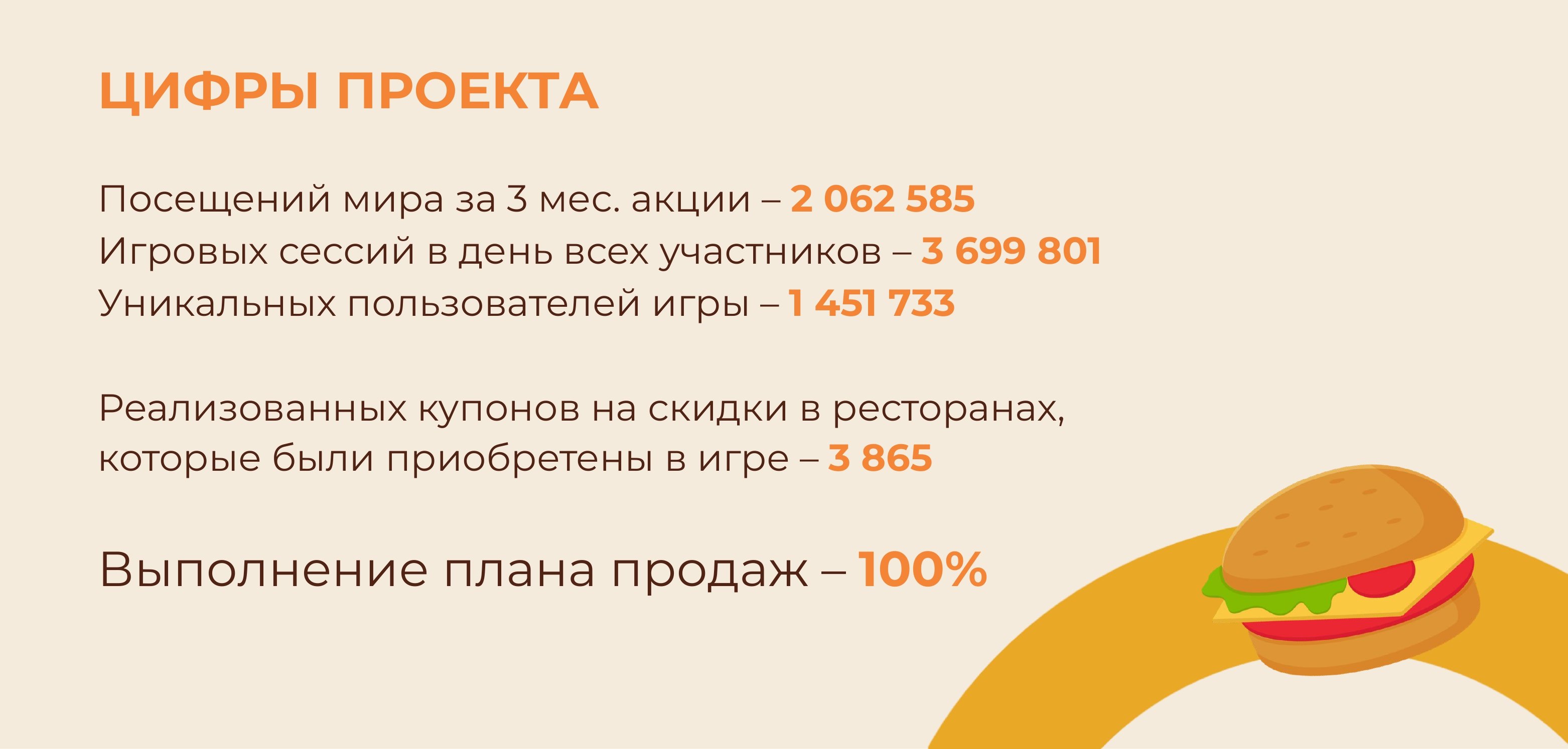 Таким образом, мы обеспечили круговую конверсию: из ресторана в интерактив (тратить выигранные бонусы) и из мира обратно в рестораны (использовать купоны на скидку или, напротив, чтобы получить еще больше призовых карточек для игры).