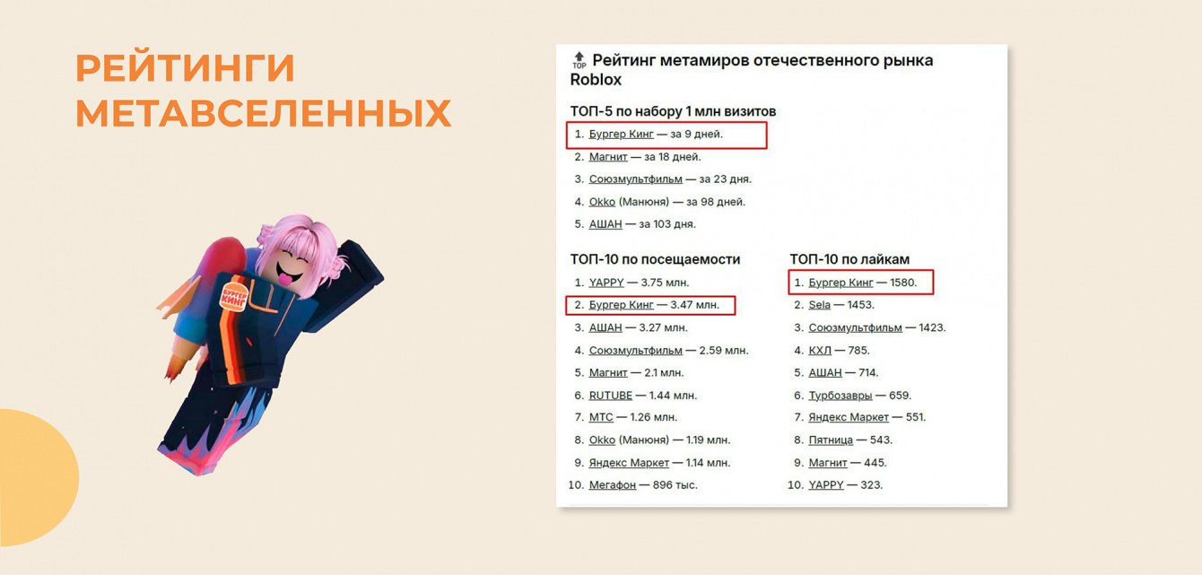 Популярность виртуального мира Бургерленд взлетала невероятно быстро. Мы заняли первую строчку в рейтинге метамиров отечественного рынка Roblox по набору 1 млн визитов, достигнув этой планки за 9 дней.