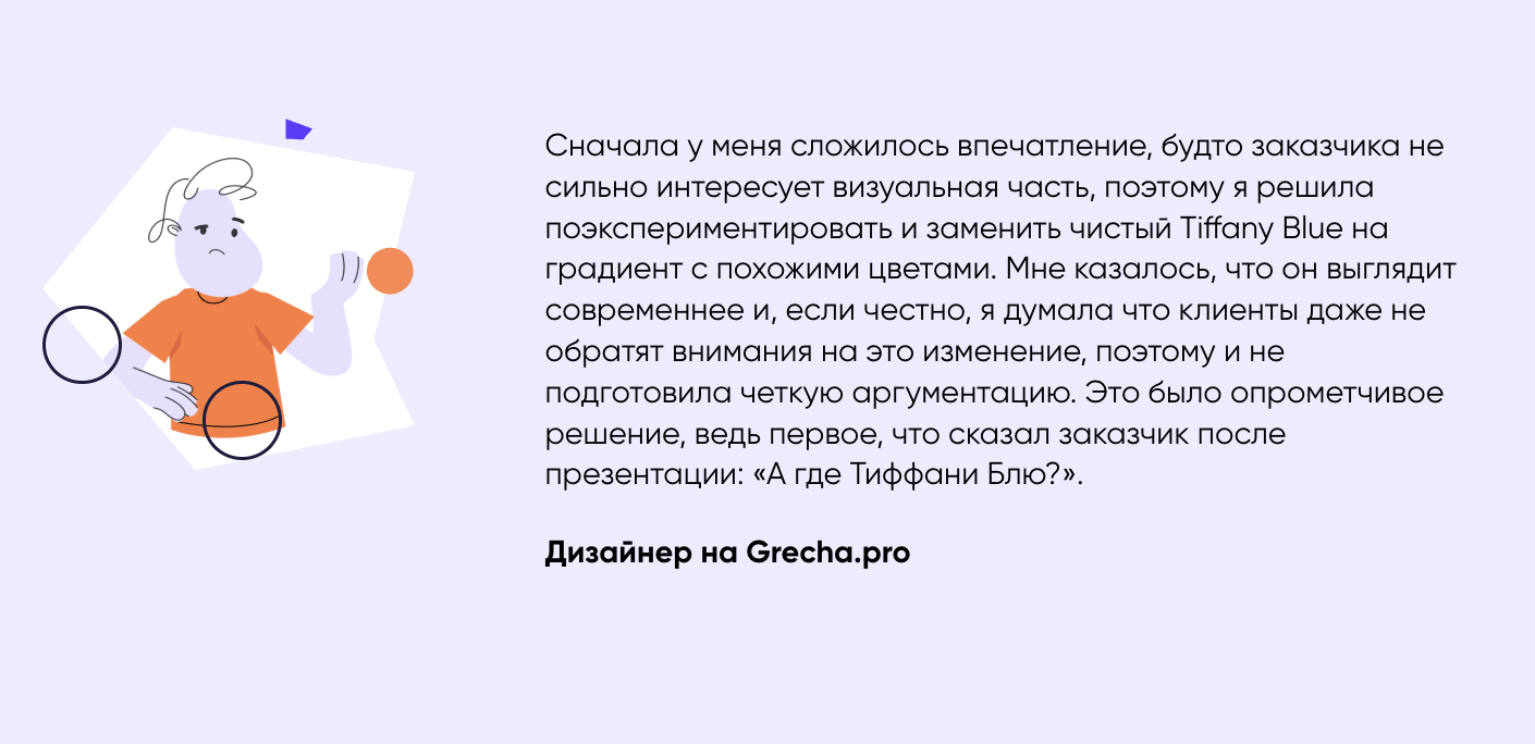 Мы учли свои ошибки и теперь, если видение клиента и наше немного отличаются, мы делаем 2 цветовых решения: так, как просил заказчик, и наш вариант. В итоге заказчики остались при своем мнении — Tiffany Blue быть.