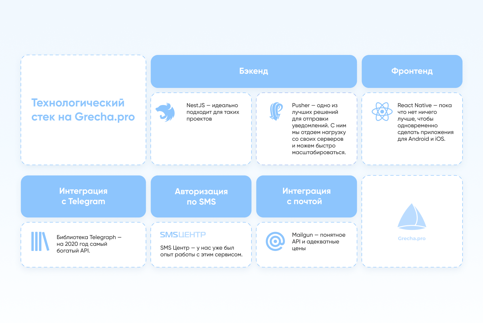 С сервисом SMS, push-уведомлениями и фронтом проблем не было, а вот с Telegram и Mailgun пришлось немного попотеть. Предполагалось, что приложение пока что помогает только рестораторам. Поставщики общаются в привычных для них каналах связи: Telegram и email.