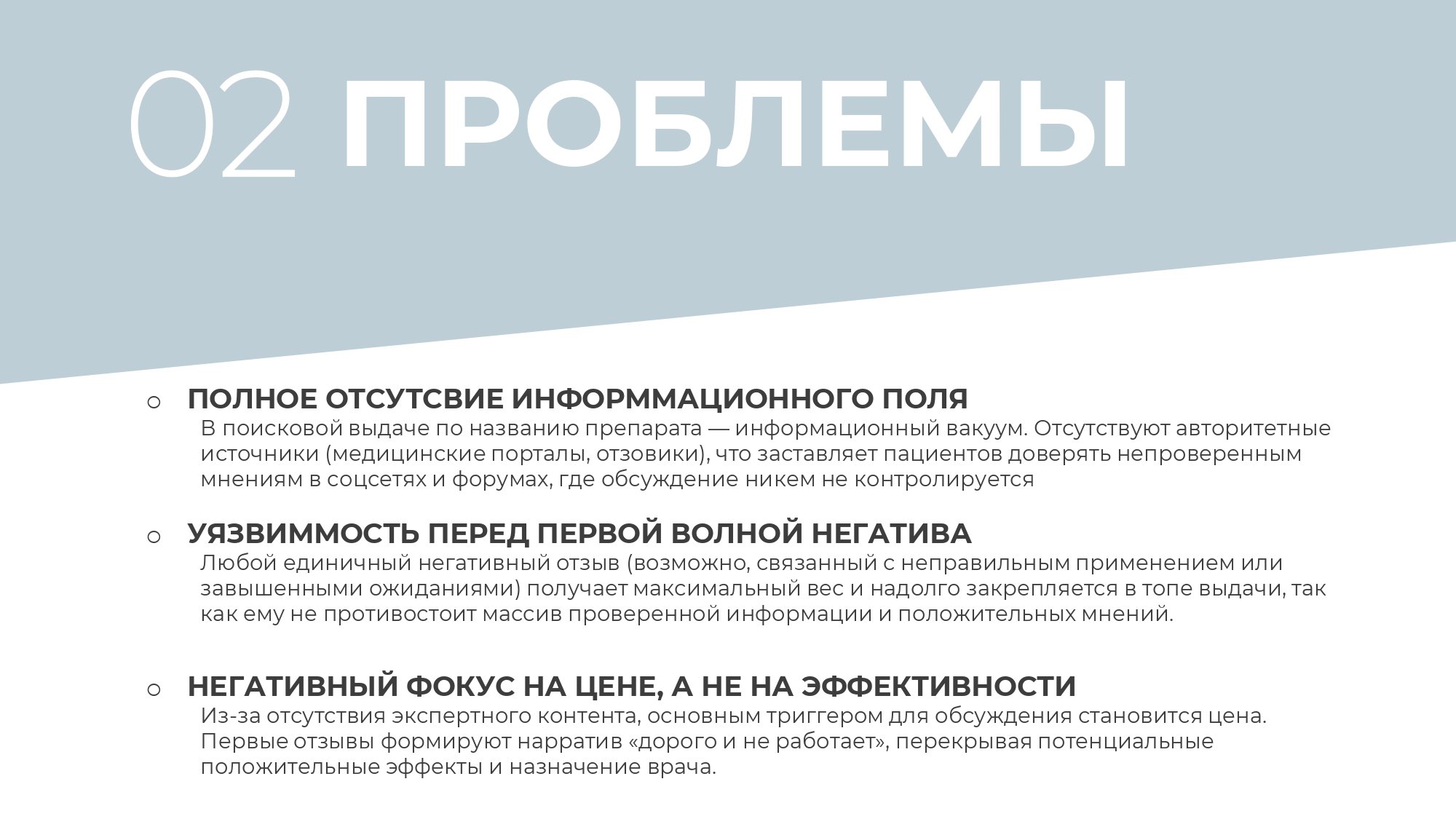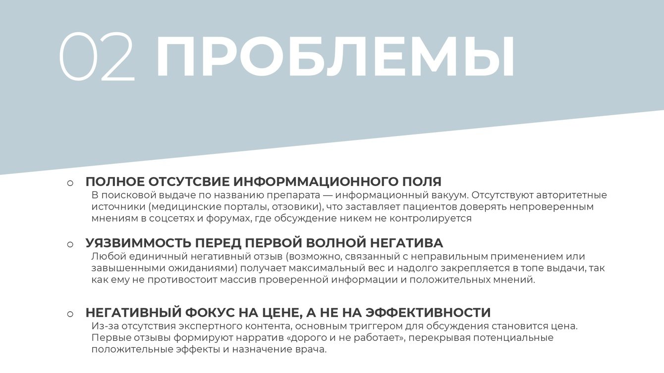 В поисковой выдаче по названию препарата информационный вакуум. Отсутствуют авторитетные источники (медицинские порталы, отзовики ), что заставляет пациентов доверять непроверенным мнениям в соцсетях и форумах, где обсуждение никем не контролируется