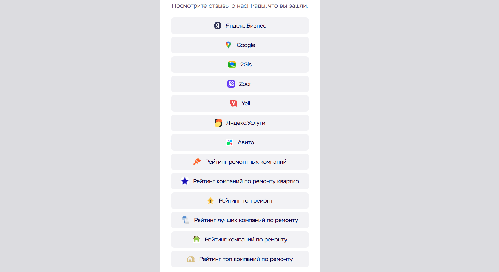 Мы не забывали ни на минуту и про опубликование позитивного контента и про упоминания, всем этим продолжили заниматься, да что там и сейчас пока пишется этот кейс мы работаем и также рейтинги только растут. Кстати, без согласования с крупными ремонтными рейтингами мы добавили компанию и заняли позицию в топ 20 лучших компаний по ремонту. Причём с клиента мы не взяли ни копейки (подобные рейтинги платные, за добавление требуется взнос, за продвижение точно также), всё проводилось в рамках стратегии. Также компанию стали добавлять в другие рейтинги топов ремонтного рынка, что также сказалось на медийности компании. Затем создали и оформили QR-cod, а также ссылку, где человек запросто может оставить позитивный отзыв, а вот негативный, к сожалению нет, разве что отправить сообщение директору, которое также рассматривали мы, затем отдавали на "откуп".