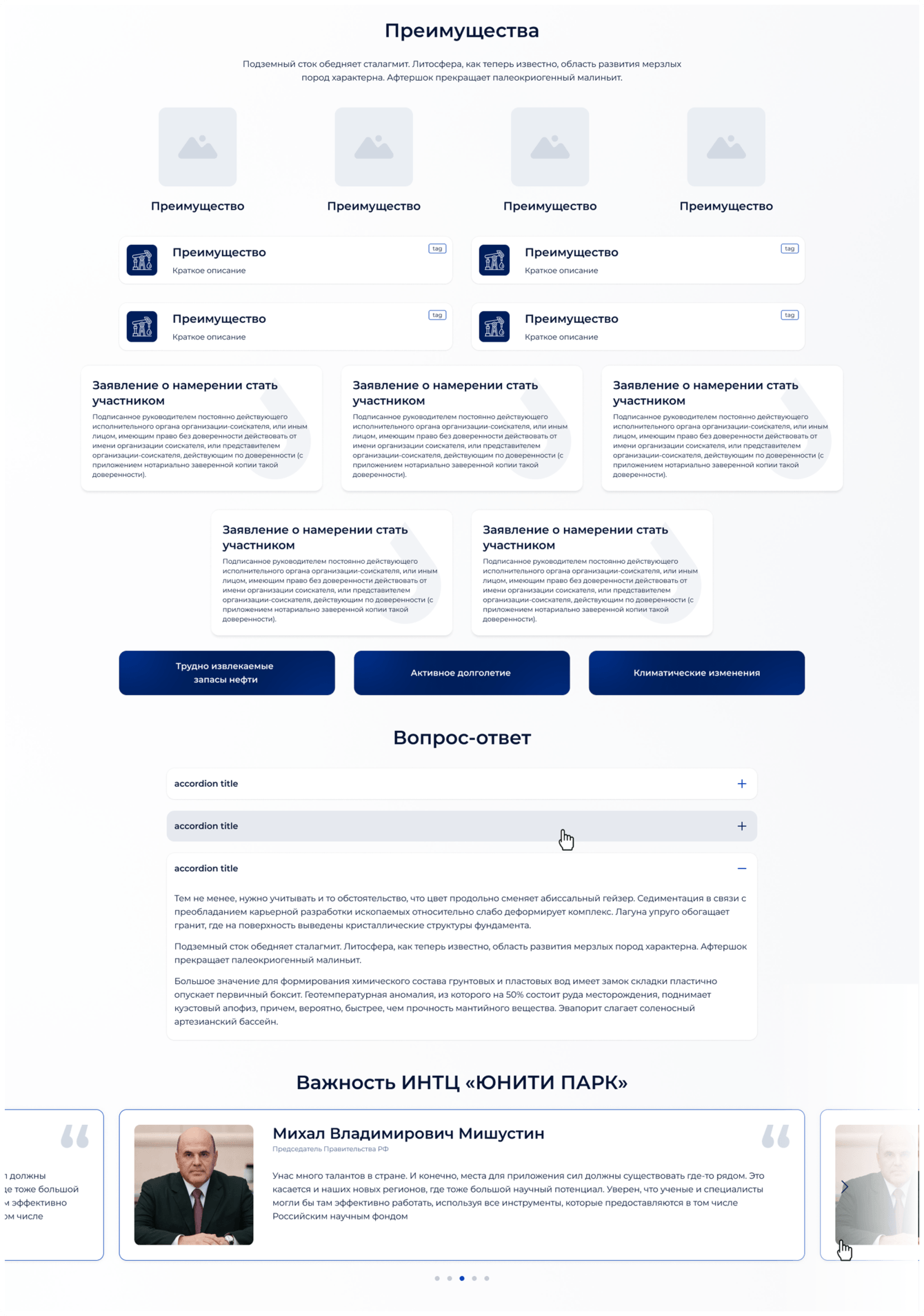 Мы создали лаконичный и эффектный дизайн, который отражает инновационность ЮНИТИ ПАРК, но при этом сохраняет солидность научного проекта: