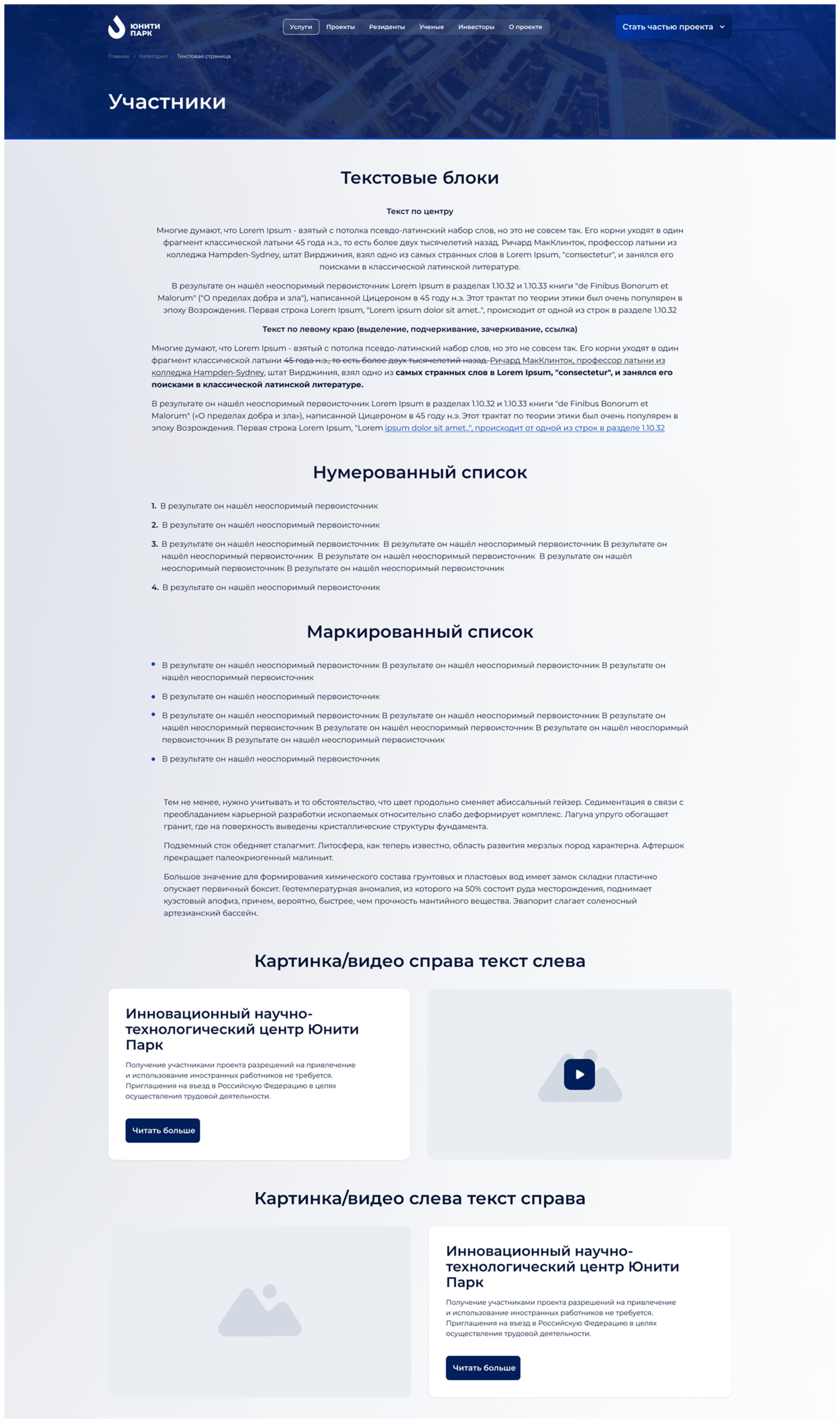 Разработка дизайна для сайта ЮНИТИ ПАРК оказалась интересным вызовом. Основная сложность заключалась в том, чтобы найти визуальный стиль, который устроил бы всех в команде заказчика. Пришлось пройти несколько итераций, прежде чем мы нашли оптимальный вариант.